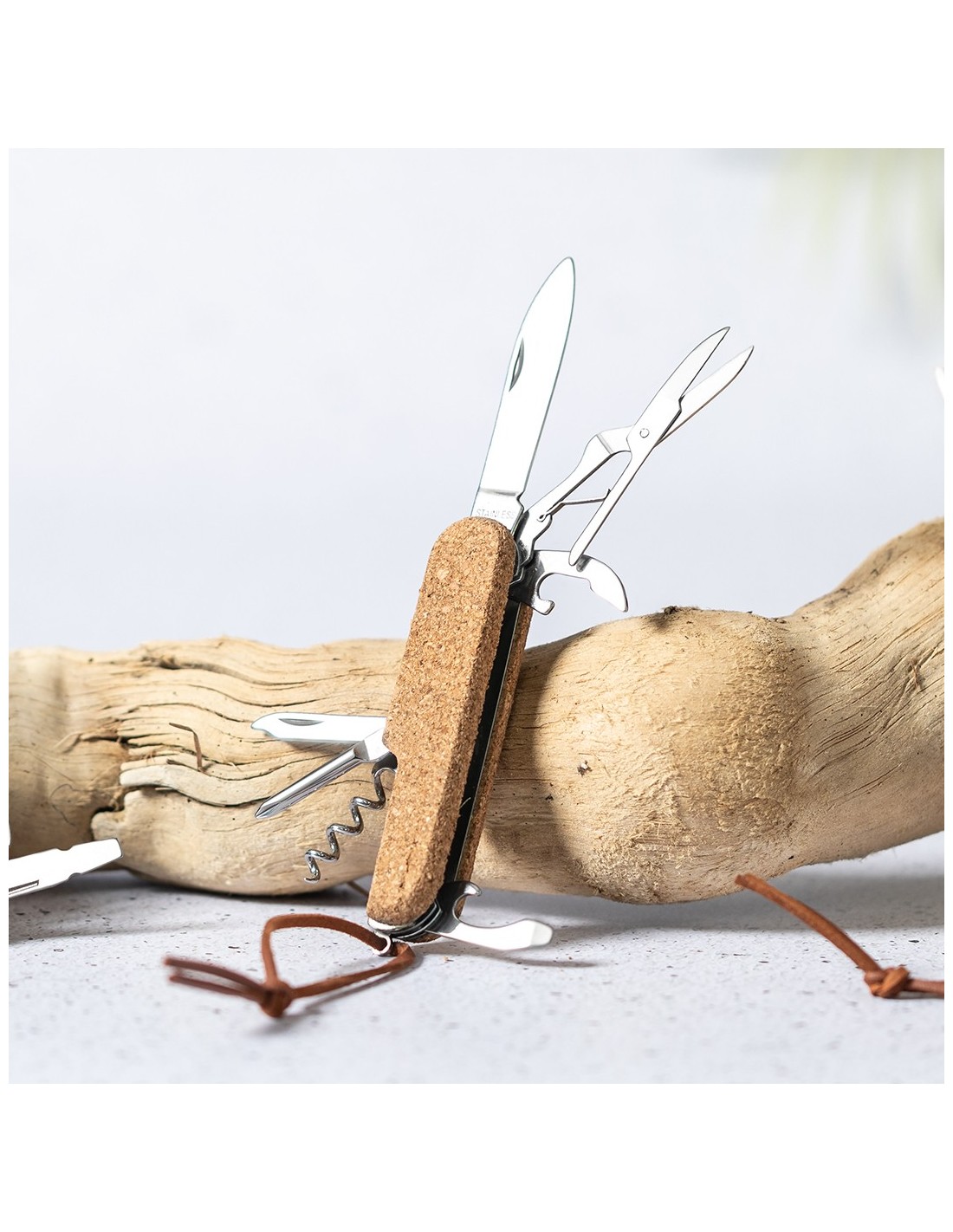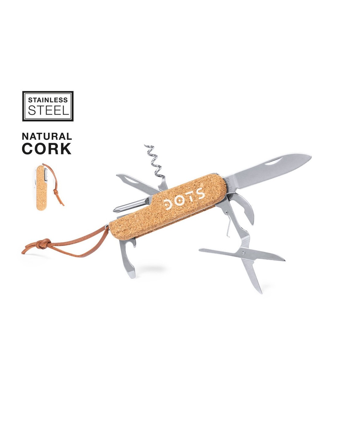 Navaja multiusos de línea nature, con resistente cuerpo en acero inox y empuñadura de corcho natural. Con 9 funciones entre otras, navaja, abridor, tijeras, lima, destornillador con puntas plana y philips, sacacorchos… Cordón a juego en polipiel y presentada en caja individual de diseño kraft.