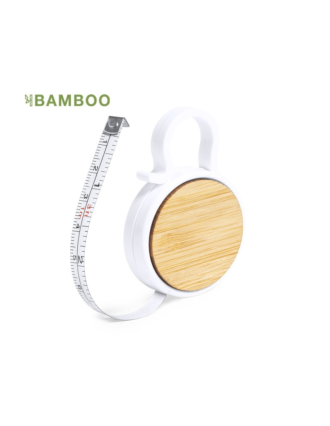 Flexómetro 1 m en resistente ABS blanco, con detalle en bambú en el cuerpo y anilla de transporte. Con amplia superficie de marcaje y hoja con medidas en centímetros y pulgadas.