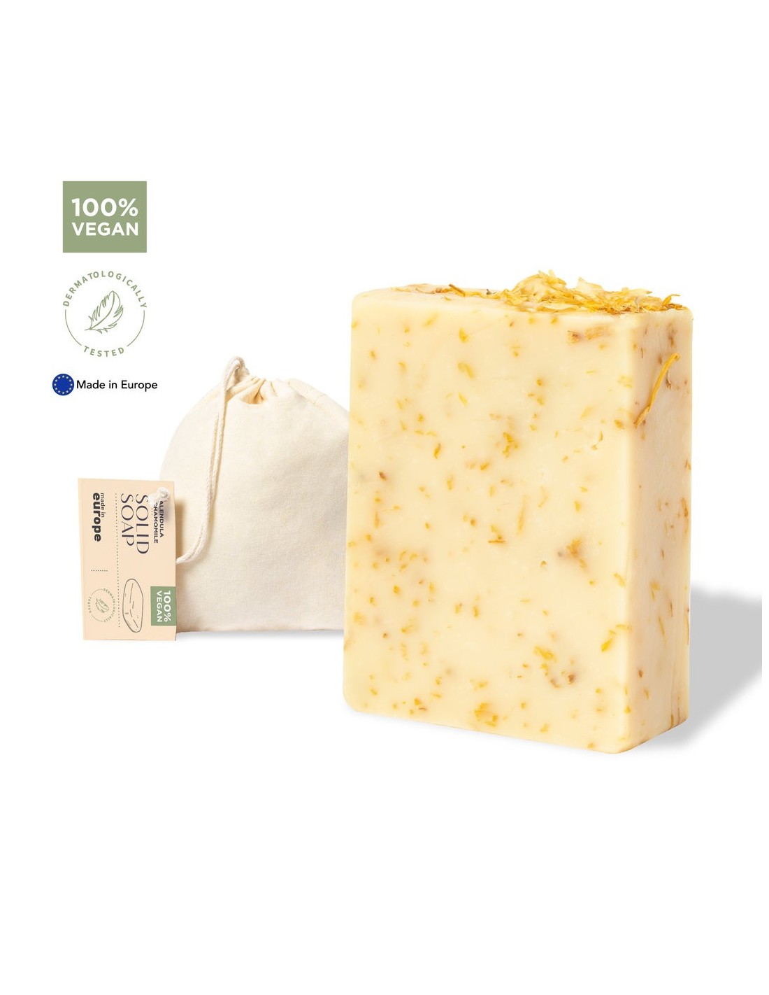 Pastilla de jabón vegano de 100 gr. Aroma de caléndula y manzanilla; con propiedades calmantes, hidratantes y reparadoras. Dermatológicamente testado y de fabricación europea. Presentación en bolsa individual de algodón, con cierre de cordón y etiqueta distintiva. Producto sostenible y 100% vegano, sin ingredientes de procedencia animal. Además, no se han realizado pruebas de estos productos en animales, promoviendo el cuidado y respeto de todos ellos.