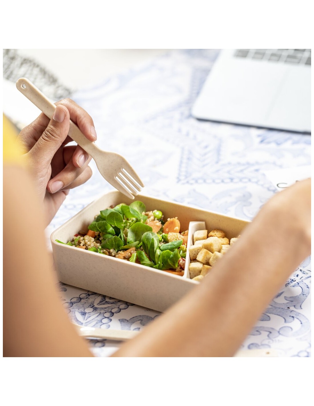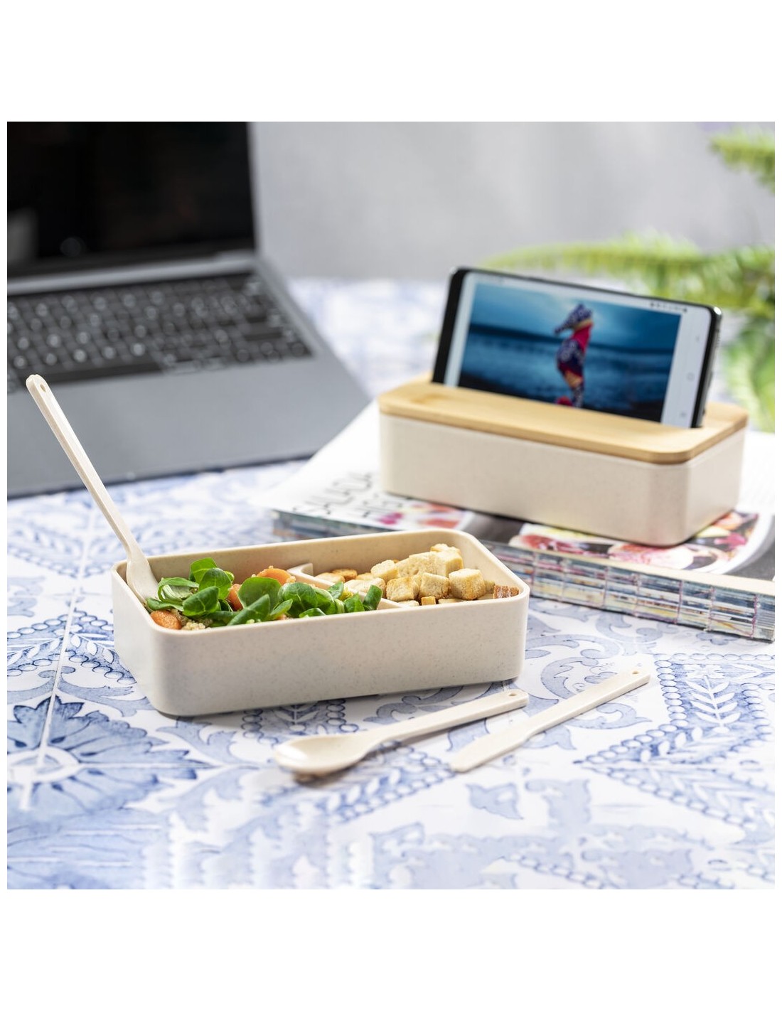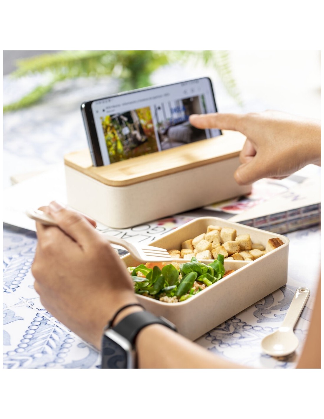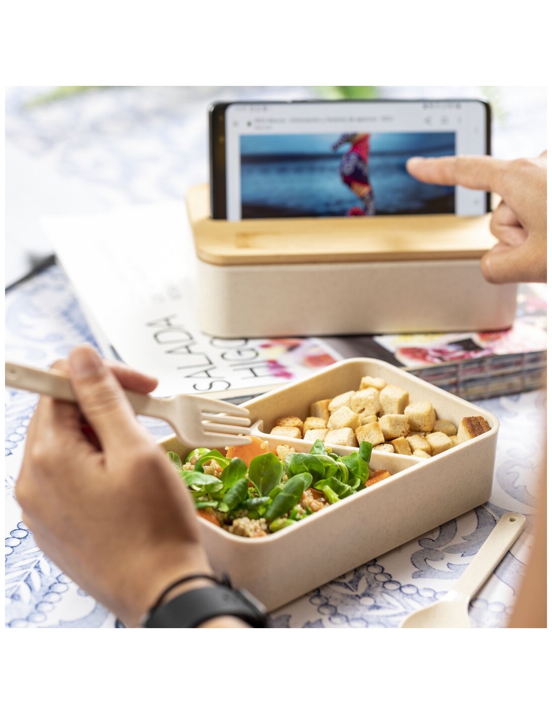 Original set de fiambreras de 1,4l en resistente material PP veteado libre de BPA. Original tapa de bambú con soporte para smartphone integrado. Dos compartimentos, cada uno de 700 ml de capacidad y compartimento interior con tenedor, cuchara y cuchillo. Incluye cinta de seguridad exterior. Certificación Food Grade, garantizando la seguridad cuando los alimentos entran en contacto con el material usado para fabricar el producto.