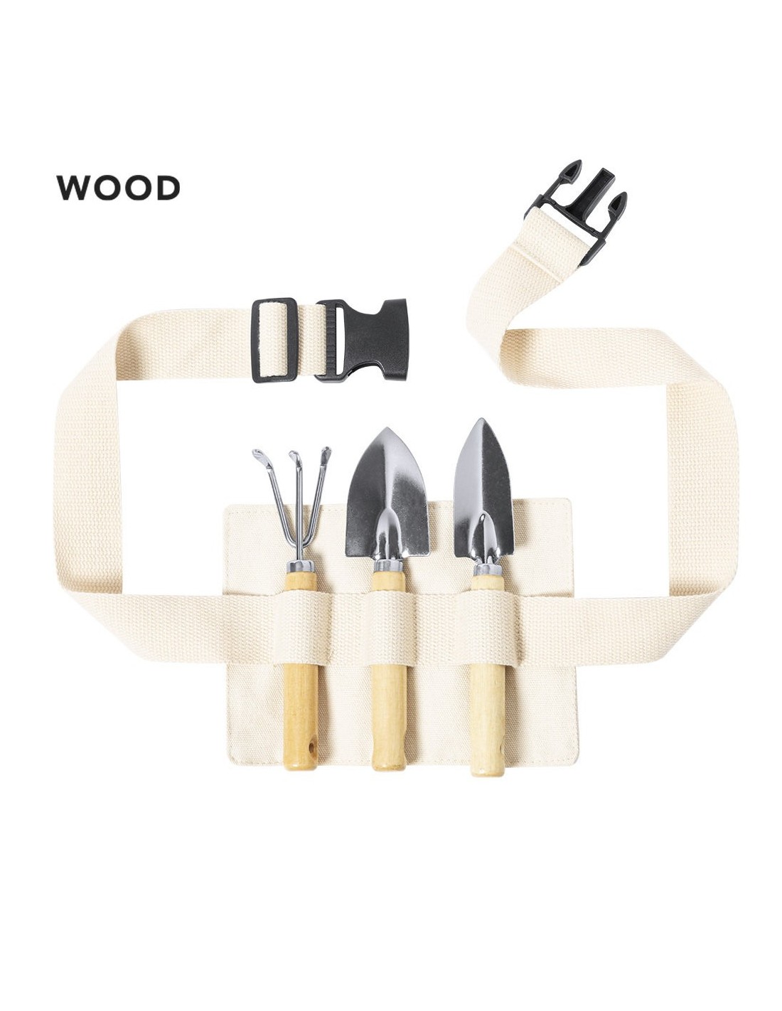 Set de jardinería de 3 accesorios, fabricado en metal con mango de madera. Incluye pala grande, pala pequeña y rastrillo. Con riñonera de transporte en algodón y cierre de click ajustable. presentado en atractiva caja de diseño eco.