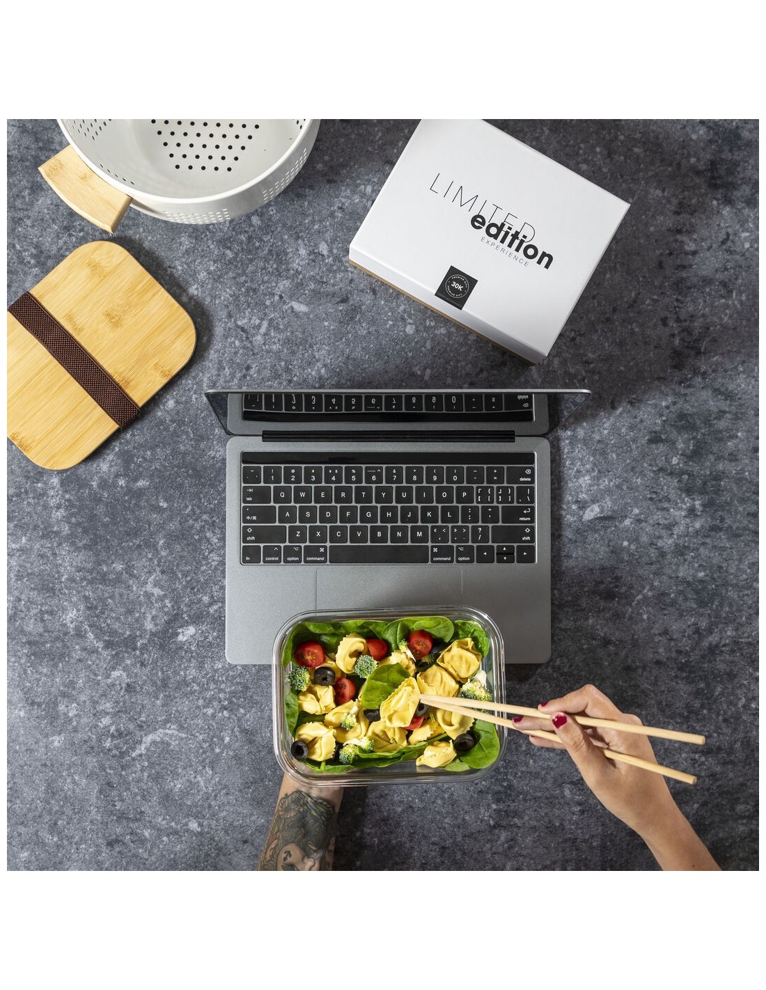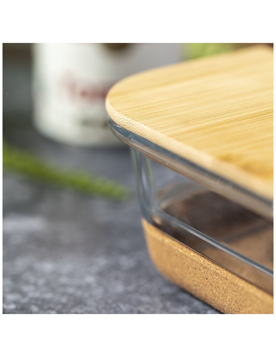 Fiambrera Limited Edition. Un fascinante diseño que conjuga diseño y sostenibilidad. Conformada por un compartimento principal en cristal de la más alta calidad de 730 ml litro de capacidad, tapa hermética en bambú y base en corcho natural. Incluye cinta de seguridad. De la perfecta combinación entre exclusividad y diseño, nace Limited Edition, una colección especial de ideas promocionales de edidición limitada. Un nuevo concepto, inspirado en la fusión de artículos premium con las últimas y más novedosas tendencias y que cuenta con una seleción limitada de unidades, convirtiendo así un regalo en una experiencia única e inolvidable. Exclusivo estuche de presentación Limited Edition, con diseño protegido por derechos de propiedad industrial. Incluida tarjeta con descripción de Limited Edition en cartón reciclado.