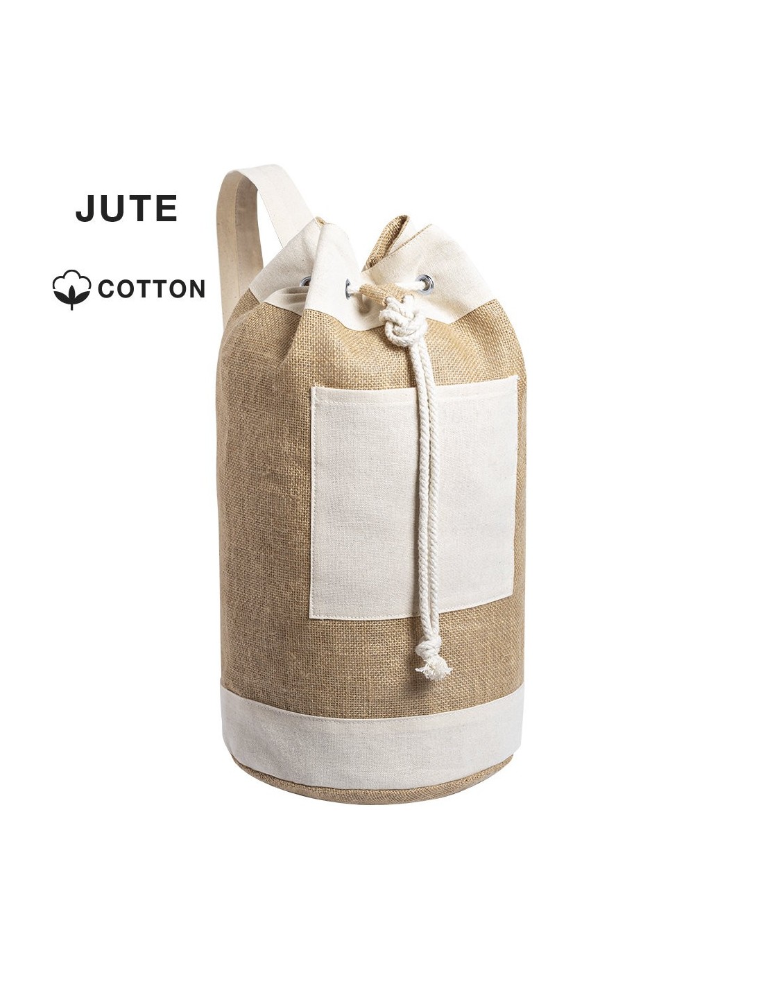 Petate multiusos de línea nature y diseño bicolor. Fabricado en yute, con detalles en algodón. Con cinta ajustable y bolsillo interior. Compartimento principal con argollas metálicas reforzadas y bolsillo frontal para fácil marcaje.