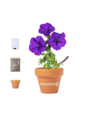 Maceta con flores de petunia. Incluye macetero fabricado en resistente terracota con agujero de drenaje + 5-8 semillas de petunia, con bolsita de sustrato para un correcto crecimiento. Presentada en atractiva caja individual de diseño. Disponible manual de instrucciones en español e inglés.