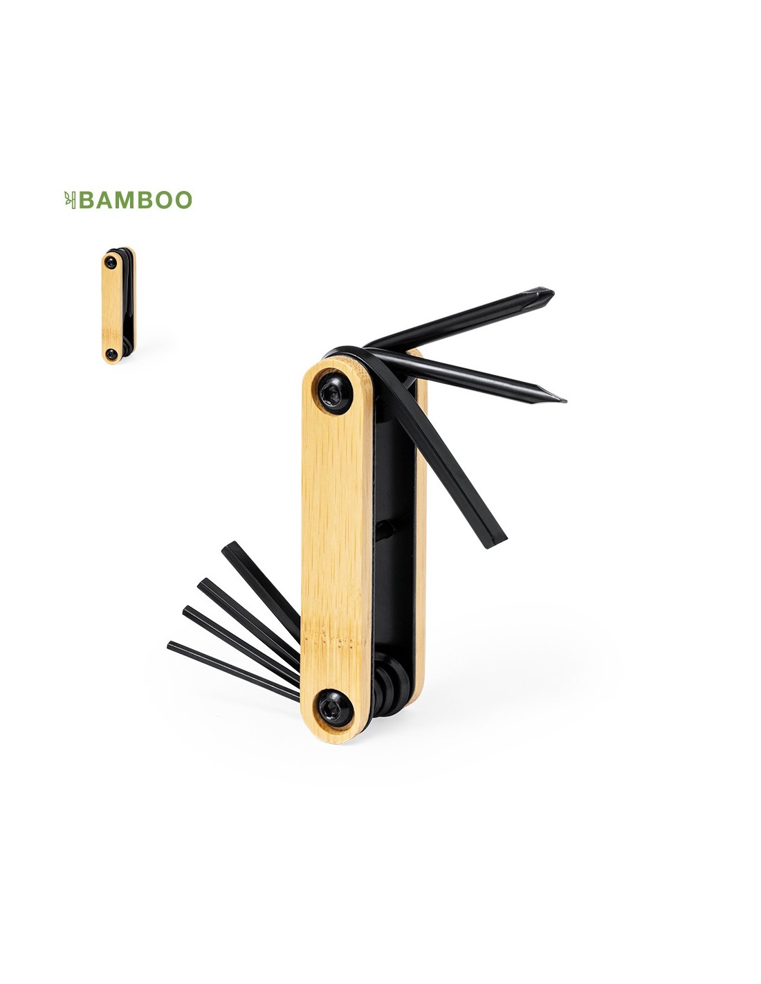 Práctica multiherramienta fabricada en resistente acero al carbono de acabado en color negro, con carcasa de bambú y 7 funciones: llaves allen, destornillador plano y philips. Presentada en caja de diseño kraft. .Materiales como el bambú fomentan la utilización de materias primas naturales, reduciendo las emisiones contaminantes. Proviene de una planta de gran resistencia y versatilidad, con crecimiento y regeneración rápidos, siendo una excelente alternativa al uso de madera tradicional.