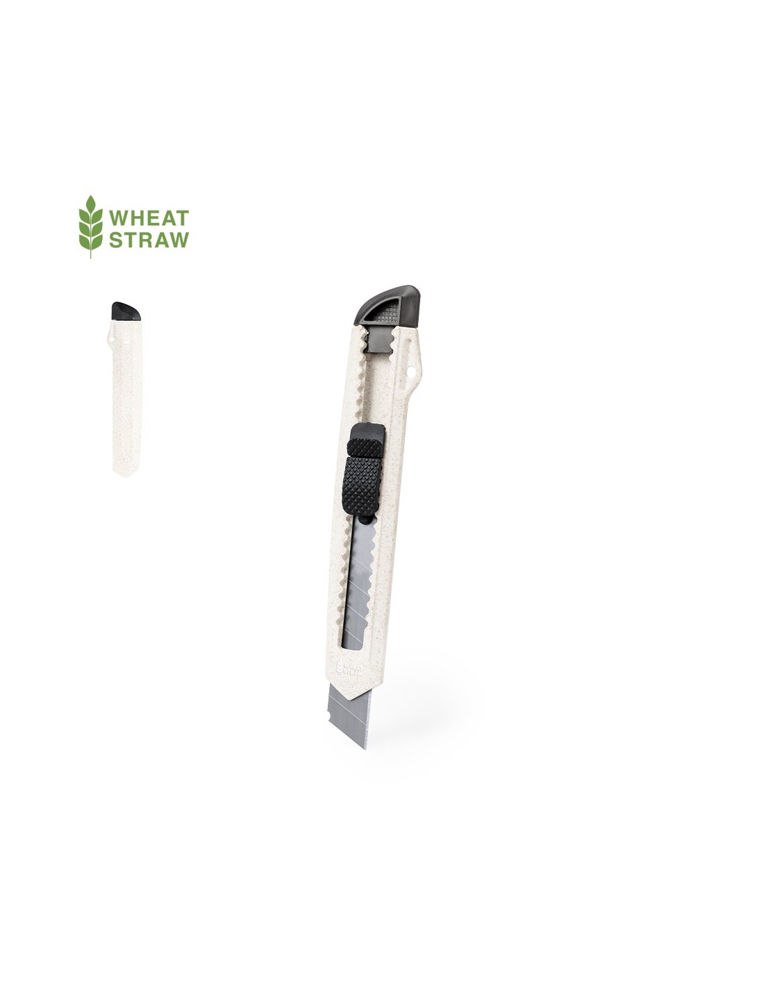 Cutter con cuchilla ancha fabricado en caña de trigo. Mango ergonómico troquelado con capucha extraíble para ajuste de corte de cuchilla, con mecanismo de bloqueo para mayor seguridad. Con logotipo caña de trigo incluido. Presentado individualmente en bolsa de papel reciclado. .La caña de trigo fomenta la utilización de materias primas naturales, reduciendo así las emisiones contaminantes.