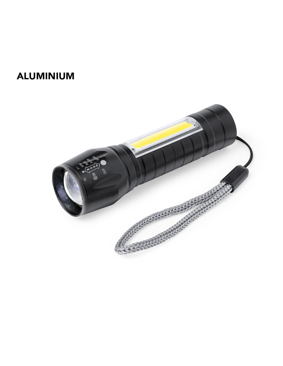 Potente linterna con batería recargable, fabricada en aluminio de acabado en color negro. Luz frontal con 1 LED y cabezal regulable, para tener un enfoque más focalizado o abierto. Además, cuenta con 10 luces COB en el mango y tres modos de iluminación (fija e intermitente de dos velocidades), incluye cinta de trasporte. Se alimenta mediante una batería recargable de 400 mAh, incluido cable micro USB. Presentada individualmente en caja de diseño.
