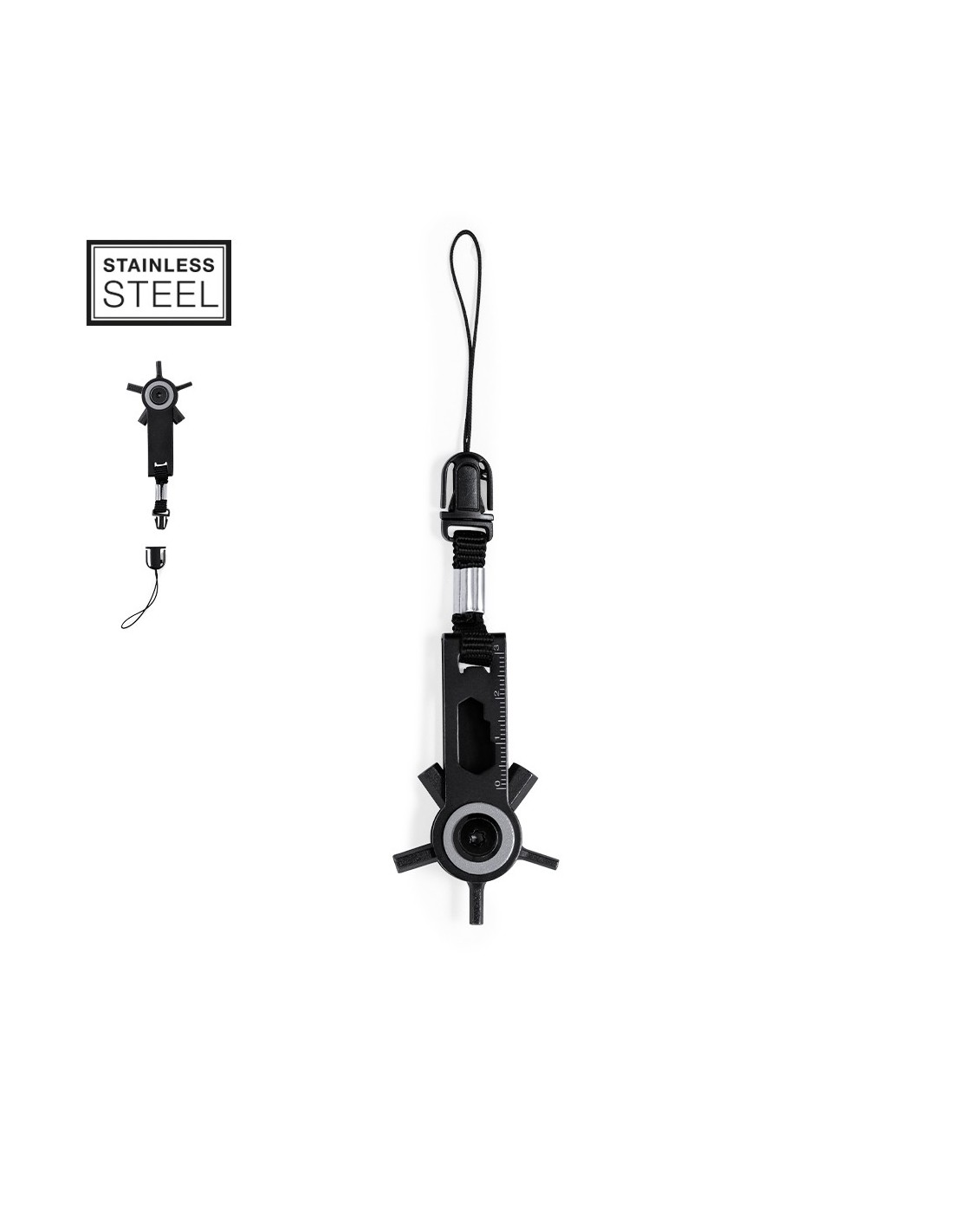 Eficaz multiherramienta con cabezal giratorio fabricada en acero inox y acabado en negro. Con 10 funciones: llaves allen, llave para tuercas hexagonales en varios tamaños, regla y un práctico accesorio de transporte con cierre de hebilla. Presentado en bolsa de papel reciclada de diseño kraft.