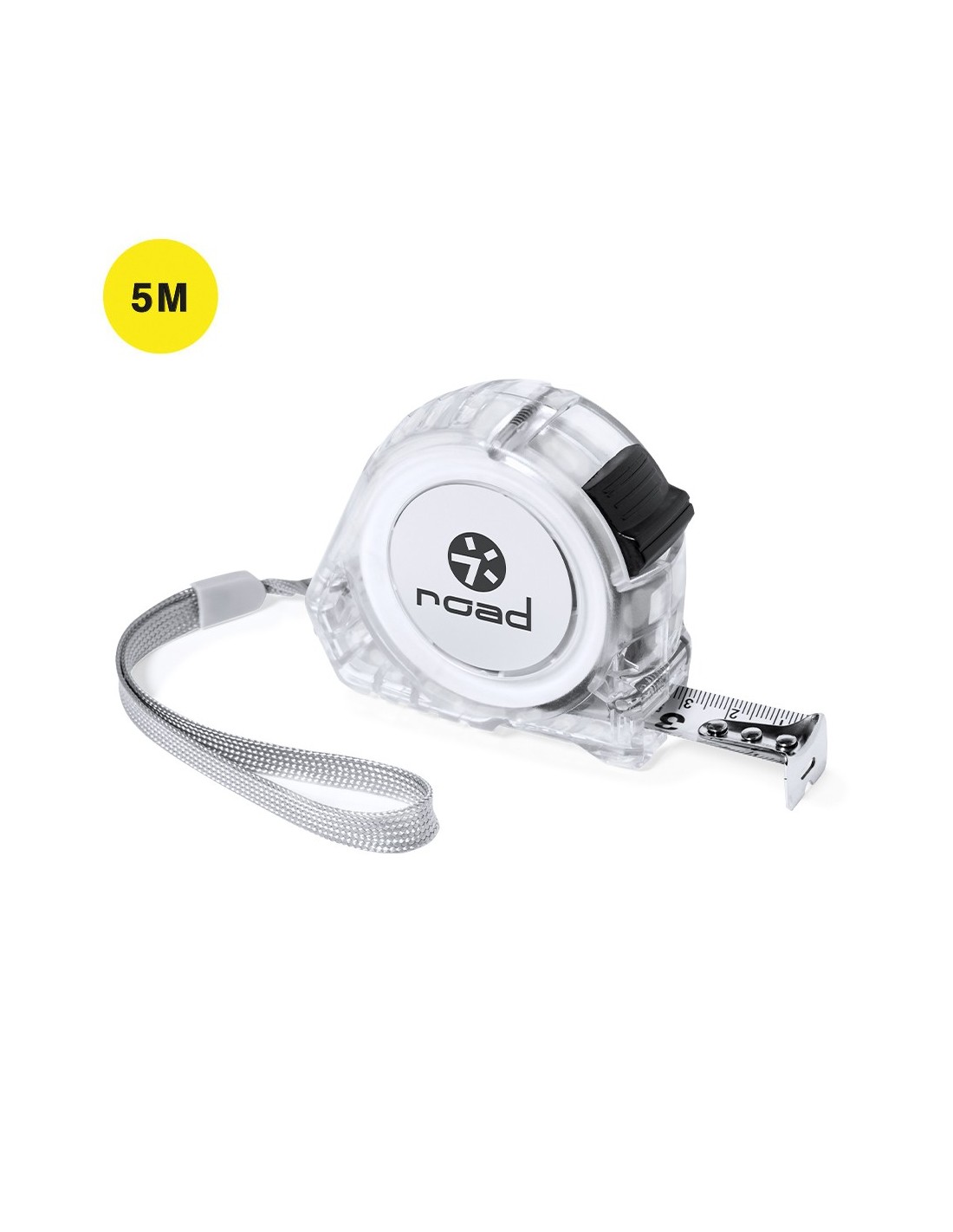 Flexómetro de 5 metros con cuchilla metálica y mecanismo de bloqueo. Con cuerpo en original acabado transparente, clip metálico para cinturón y cinta de transporte, con zona especial de marcaje. Presentado individualmente en caja de diseño kraft.