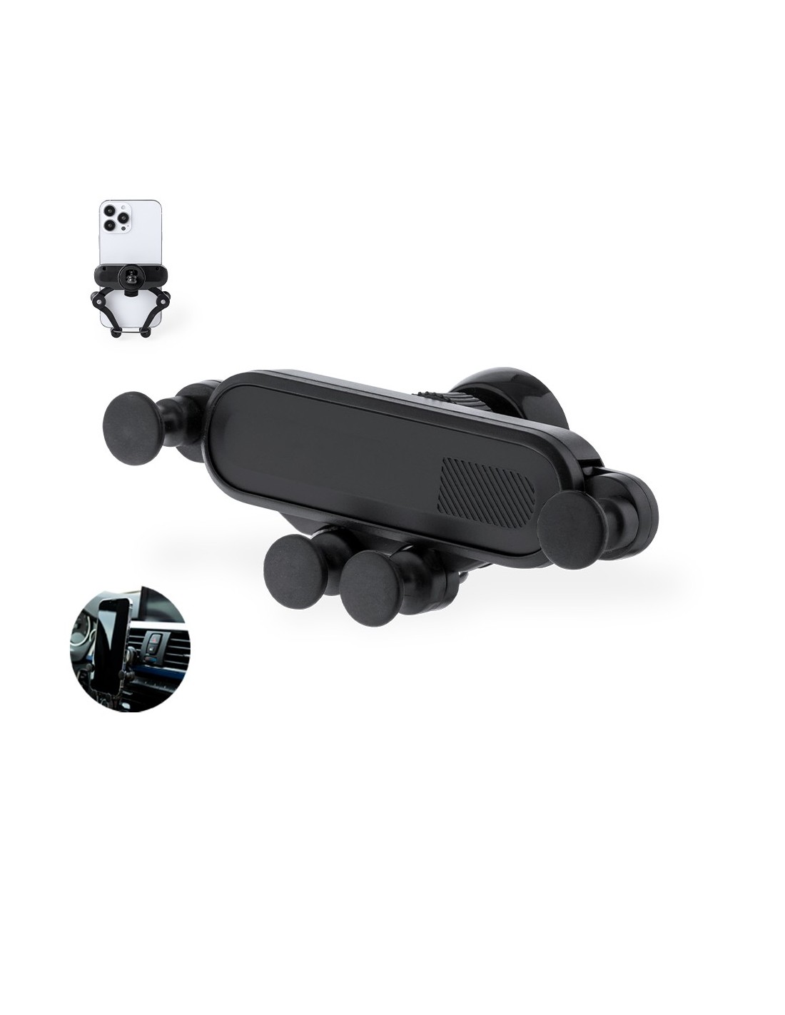 Ingenioso soporte para smartphone de diseño minimalista y especialmente diseñado para smartphones tamaño XXL. Con sistema de fijación universal que se adapta con el propio peso del teléfono, ajustando los enganches de agarre una vez se sitúa el dispositivo en el soporte. Para rejilla de ventilación del automóvil y con frontal especialmente diseñado para marcaje. Presentado en caja de diseño kraft.