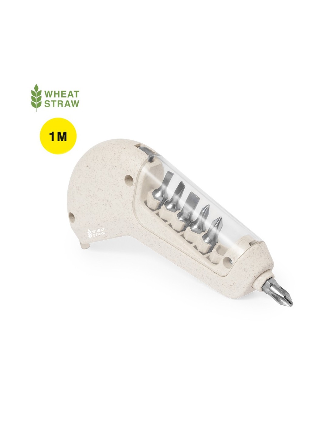 Práctico flexómetro multiherramienta, fabricado en caña de trigo. Esta herramienta versátil ofrece 6 funciones en las que incluye: metro en pulgadas y centí metros (longitud de 1 metro) y función destornillador con 3 puntas planas y 3 philips, todas guardadas en la empuñadura con ventana transparente. Con logotipo caña de trigo incluido. Presentado en caja individual..La caña de trigo fomenta la utilización de materias primas naturales, reduciendo así las emisiones contaminantes.