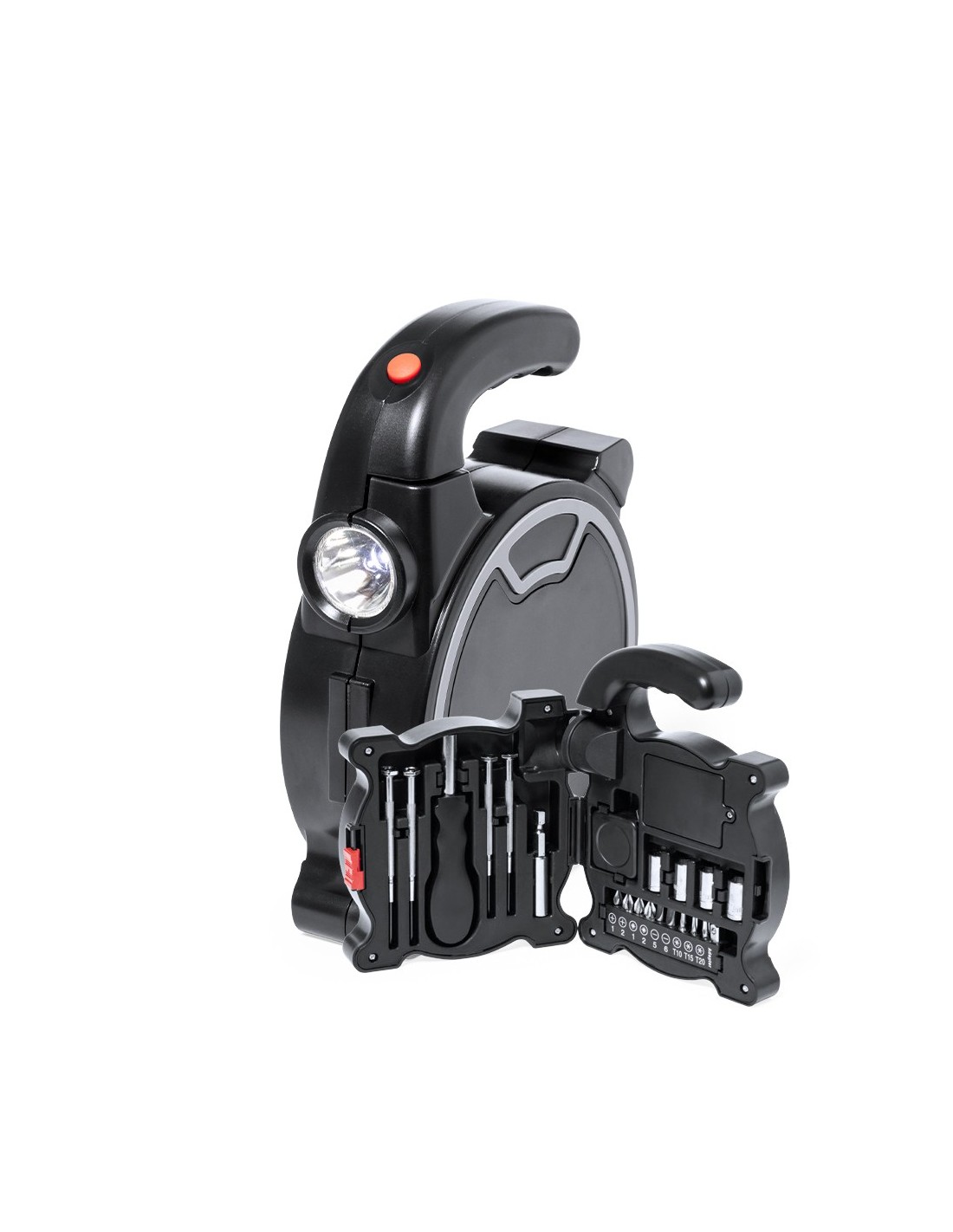 Set de herramientas en estuche de ABS con linterna incorporada y mango ergonómico, provisto con 4 Leds alimentados por 3 pilas AAA (no incluidas). Dispone de 21 accesorios en su interior: destornilladores de precisión (planos y philips), mango multifunción para cabezales compatibles (philips, planos, estrella, adaptador), llaves de tubo y flexómetro. Presentado en caja de diseño kraft.
