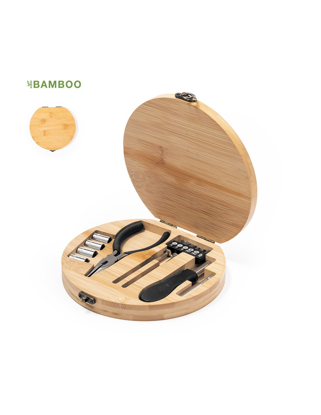 Set de herramientas presentado en resistente caja de bambú con cierre metálico. Con interior troquelado en bambú para un perfecto ajuste de las herramientas. Incluye 15 accesorios: llaves de tubo, alicates con sección cortante, destornilladores de precisión (plano y philips) y destornillador con multitud de puntas planas, philips, hexagonales y torx. Presentado en caja de diseño kraft. .Materiales como el bambú fomentan la utilización de materias primas naturales, reduciendo las emisiones contaminantes. Proviene de una planta de gran resistencia y versatilidad, con crecimiento y regeneración rápidos, siendo una excelente alternativa al uso de madera tradicional.