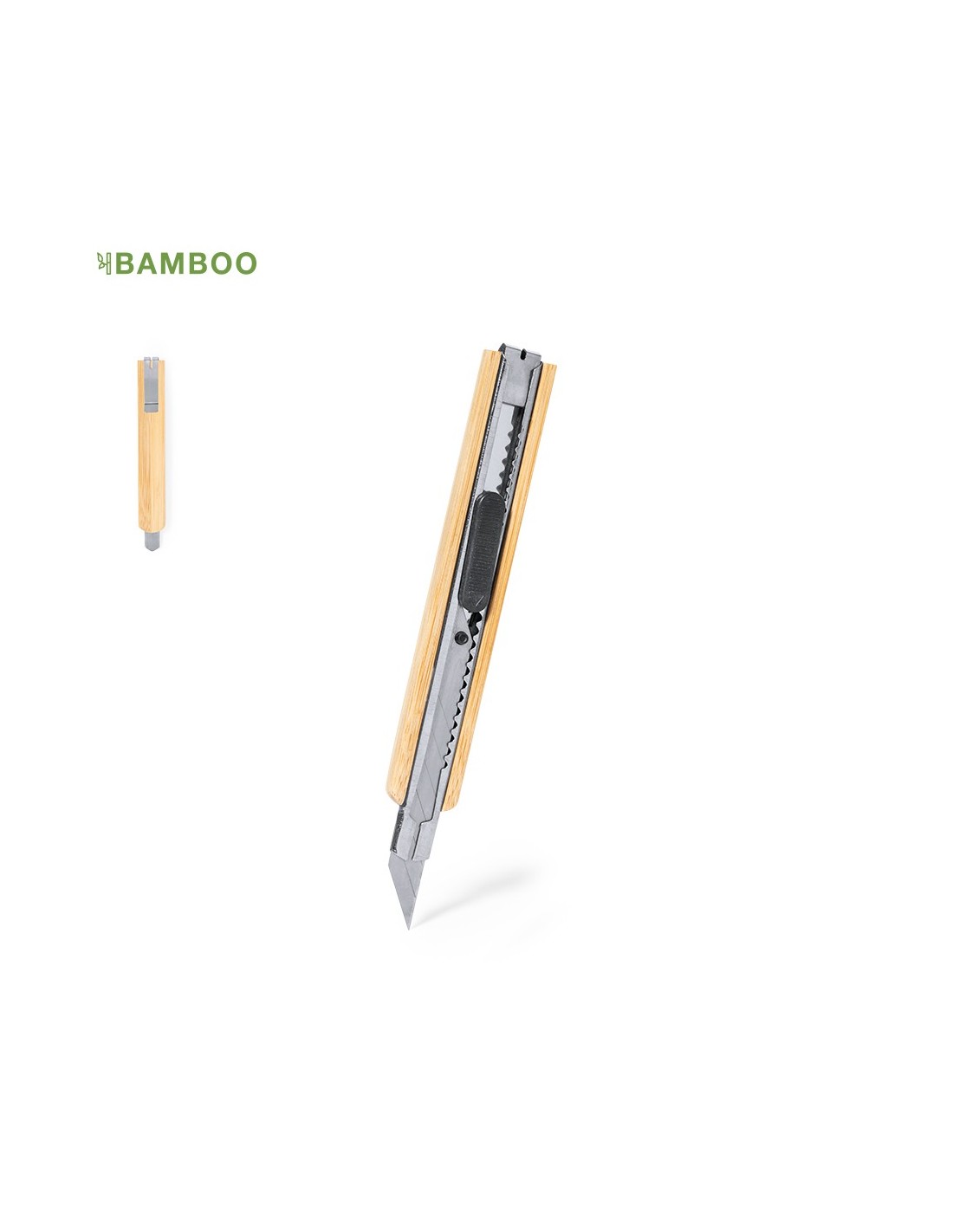 Cutter metálico con carcasa fabricada en bambú. Con mango ergonómico troquelado y clip extraíble con ranura para corte de cuchillas. Presentado individualmente en bolsa de papel reciclado. .Materiales como el bambú fomentan la utilización de materias primas naturales, reduciendo las emisiones contaminantes. Proviene de una planta de gran resistencia y versatilidad, con crecimiento y regeneración rápidos, siendo una excelente alternativa al uso de madera tradicional.
