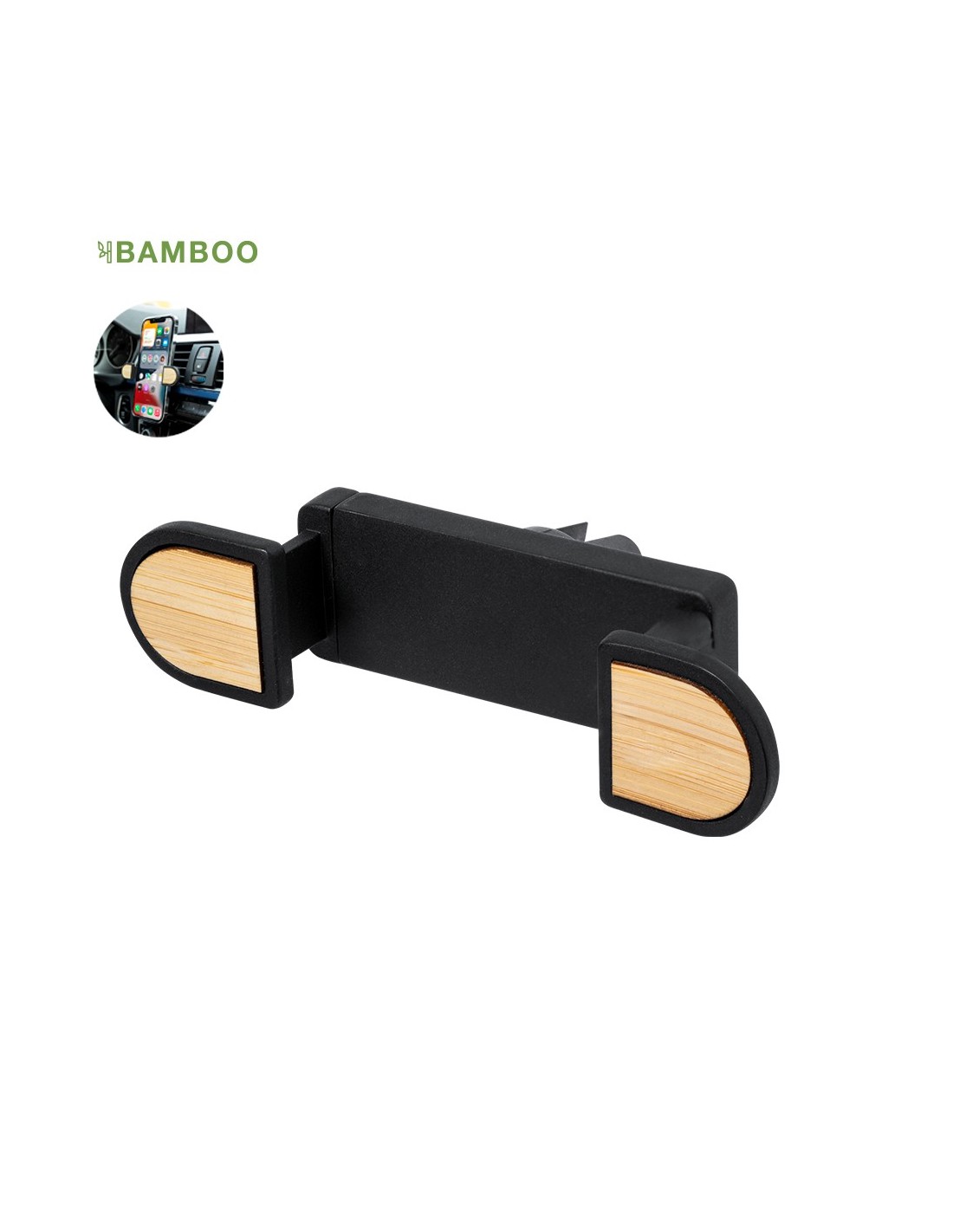 Soporte ajustable para smartphone de diseño minimalista, con base rotatoria 360º y de elegante acabado en color negro con detalles en bambú. Con sistema de fijación en rejilla de ventilación del automóvil y amplia superficie de marcaje, diseñado especialmente para tampografía. Presentado en caja de diseño kraft. .Materiales como el bambú fomentan la utilización de materias primas naturales, reduciendo las emisiones contaminantes. Proviene de una planta de gran resistencia y versatilidad, con crecimiento y regeneración rápidos, siendo una excelente alternativa al uso de madera tradicional.