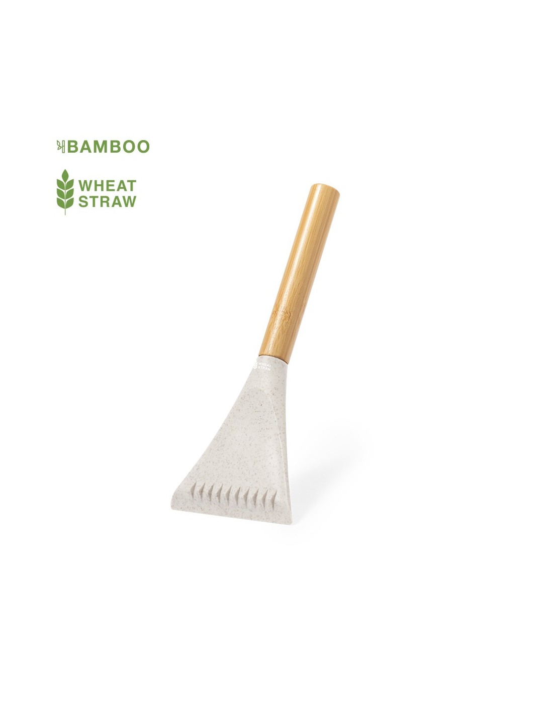 Práctico rascador de hielo fabricado en bambú y caña de trigo. Con forma de pala, su mango está fabricado en bambú y la zona de rascado está hecha de caña de trigo, con parte limpiadores y sierra integrada. Logo ditintivo en el mango y presentado individualmente en bolsa de papel kraft..Materiales como el bambú fomentan la utilización de materias primas naturales, reduciendo las emisiones contaminantes. Proviene de una planta de gran resistencia y versatilidad, con crecimiento y regeneración rápidos, siendo una excelente alternativa al uso de madera tradicional..La caña de trigo fomenta la utilización de materias primas naturales, reduciendo así las emisiones contaminantes.