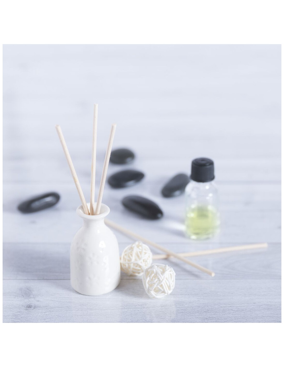 Difusor aromático de agradable aroma jazmín. Incluye tarro de fragancia en cerámica, palitos aromáticos y tarro de cristal de 15ml con fragancia. Presentado en estuche individual con compartimentos independientes y ventana.