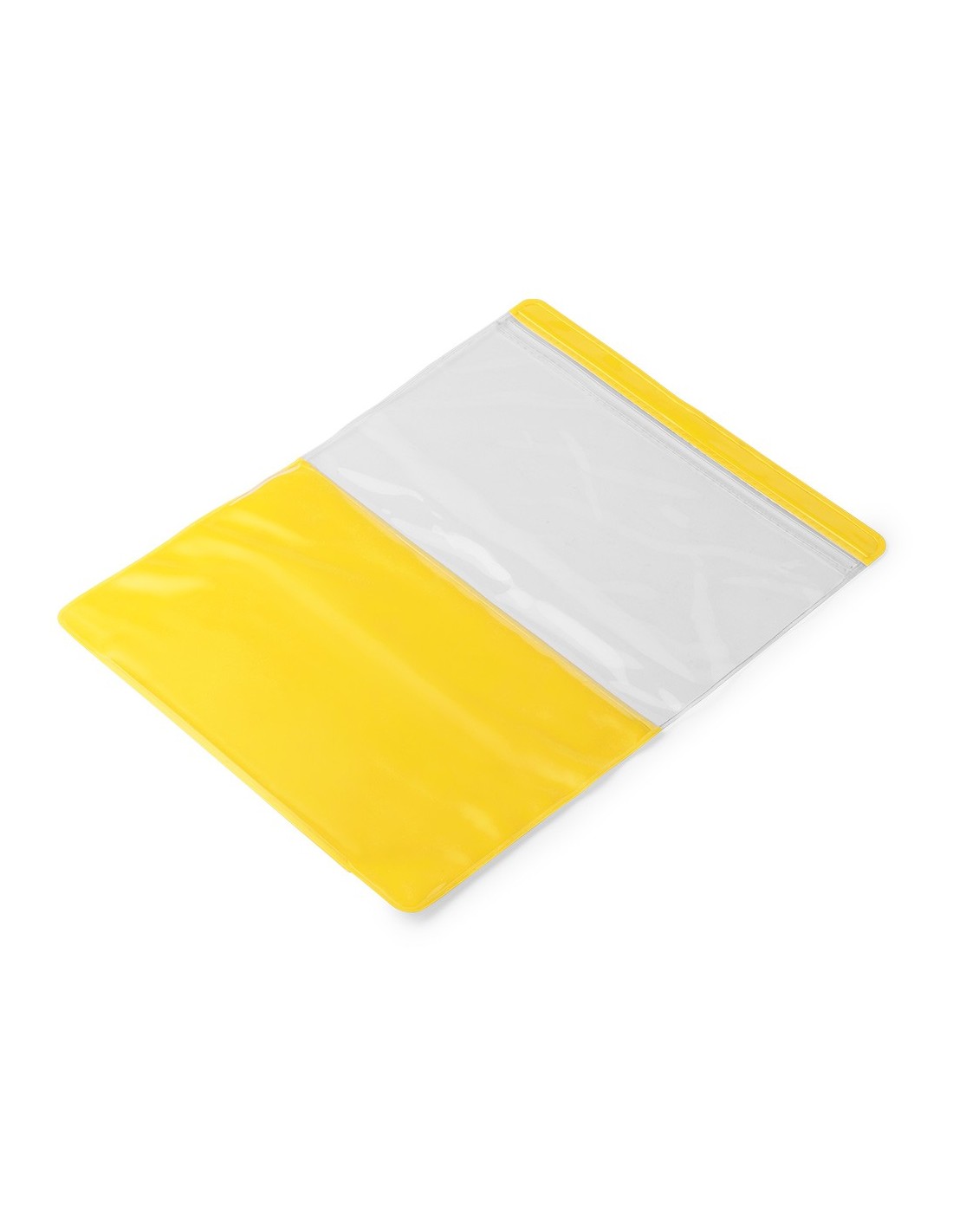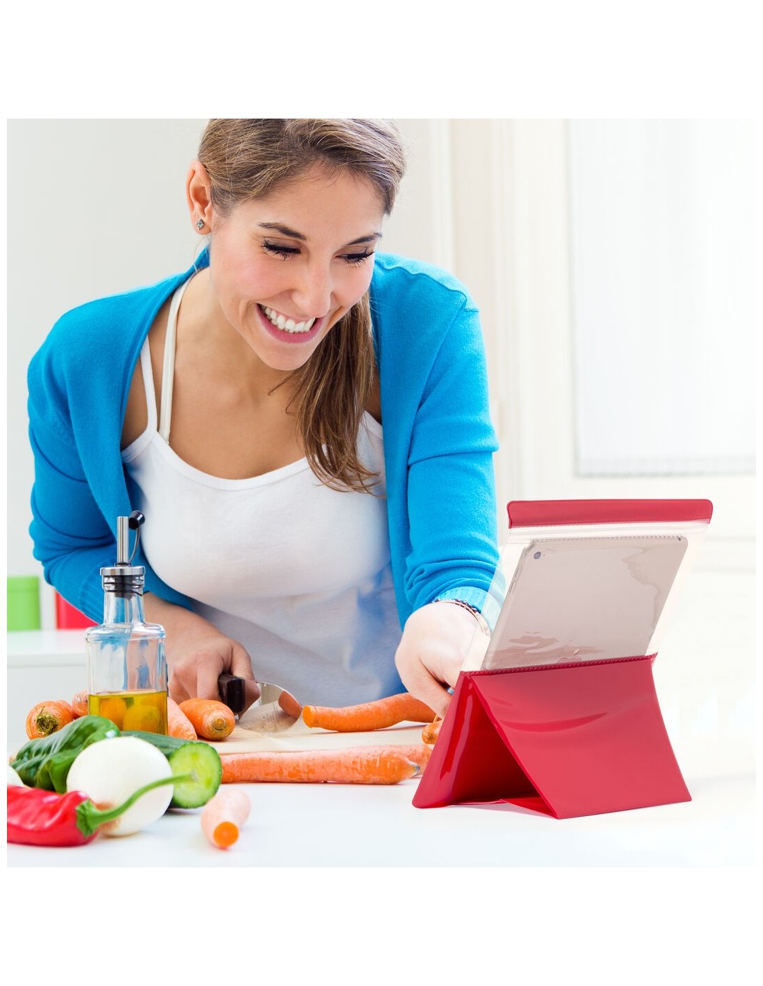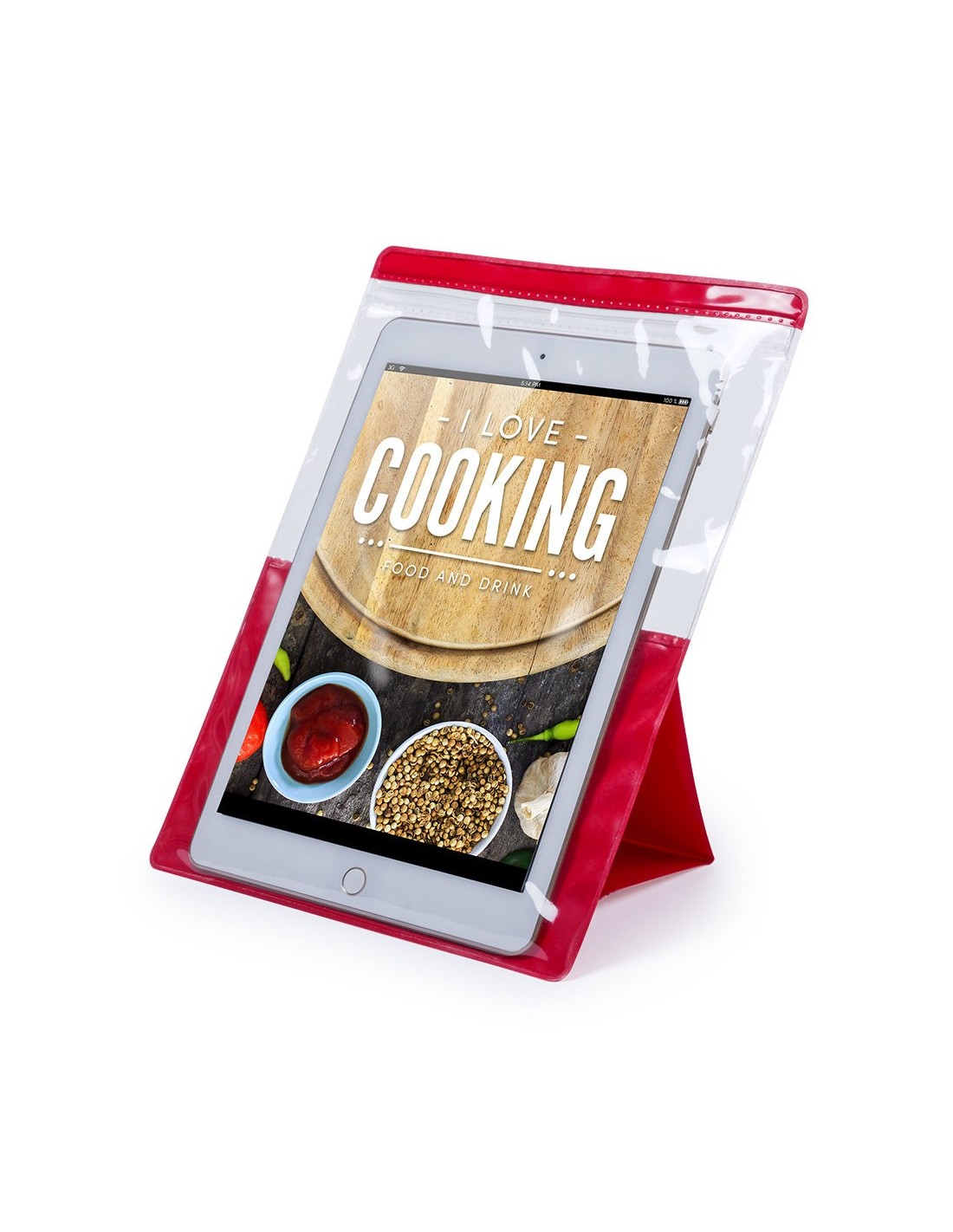 Prático portatodo impermeable en PVC en atrevido diseño bicolor, con función táctil y soporte integrado. Diseñado especialmente para tablets de hasta 9,7.