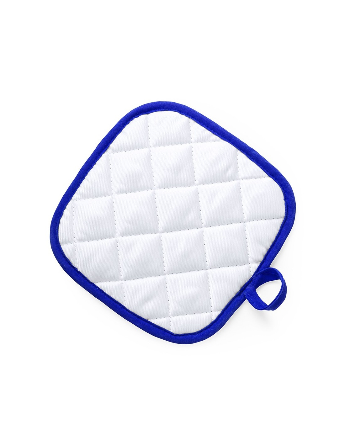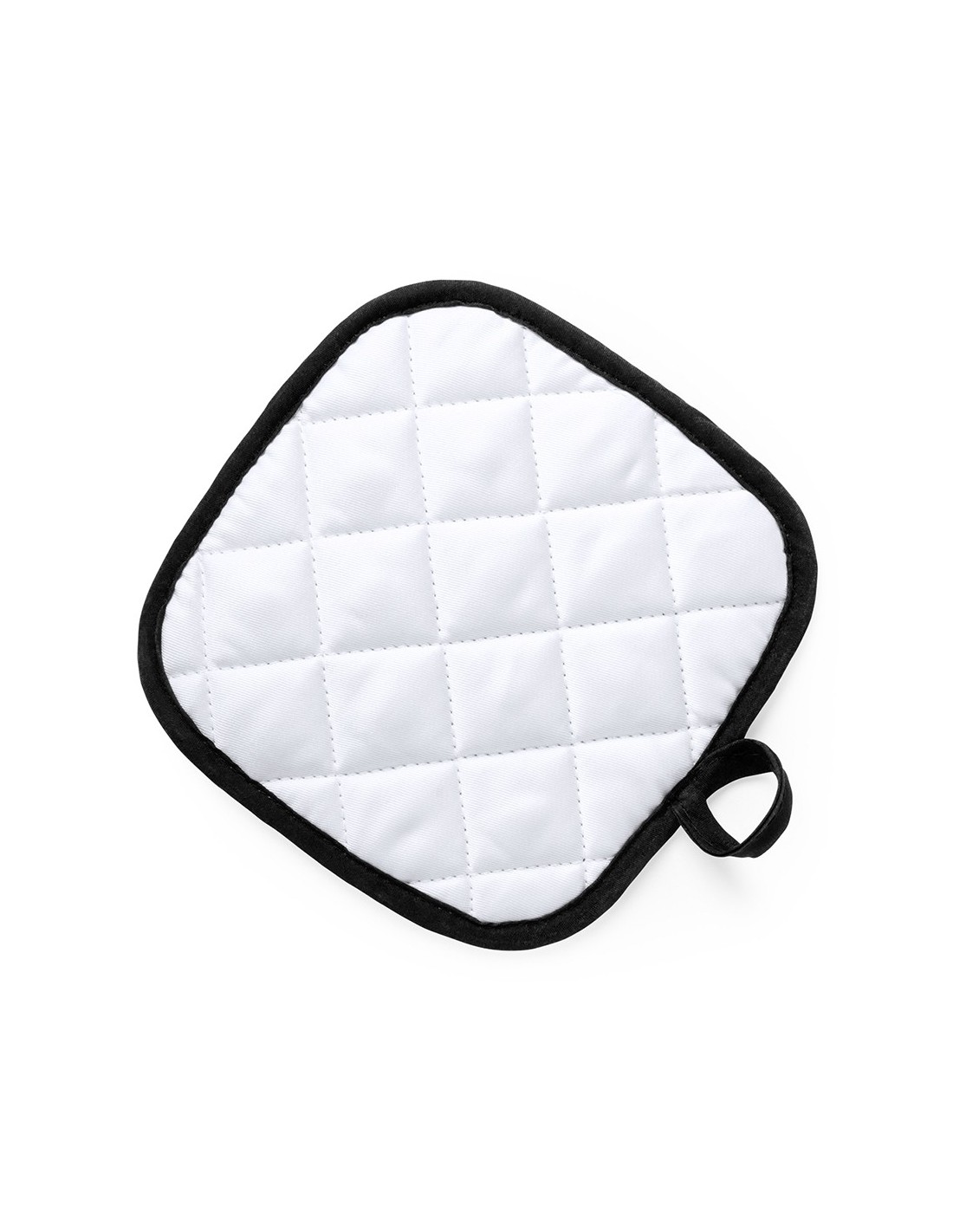 Agarrador de cocina en suave material 100% poliéster de suave acabado en color blanco y con bordes en vivos colores. Con una cara lisa especialmente diseñada para sublimación y cinta para colgar.