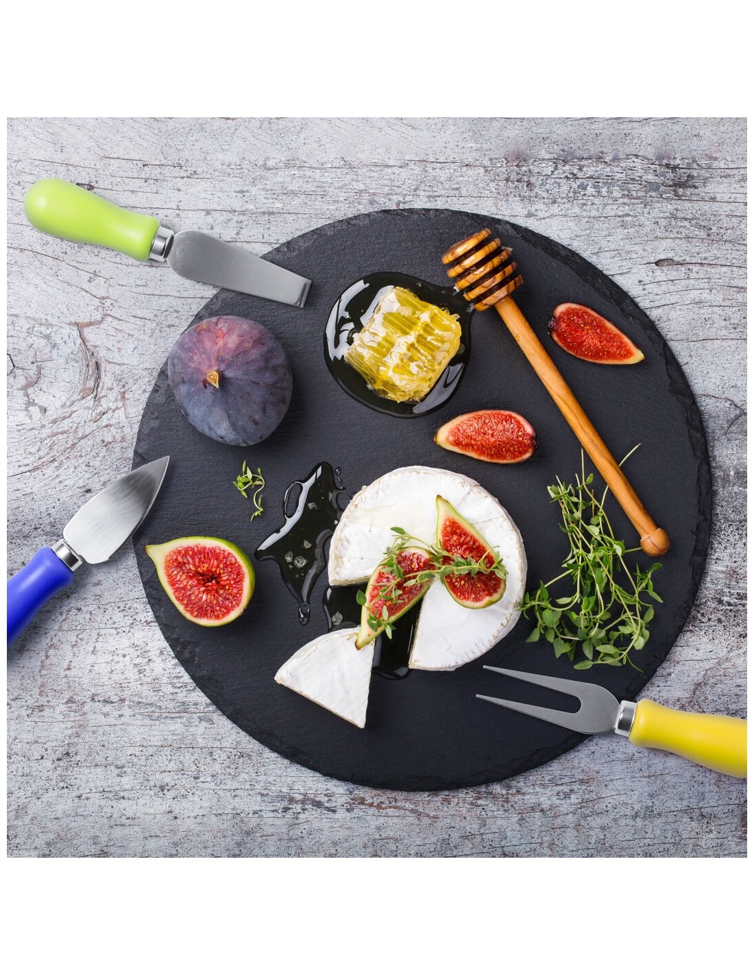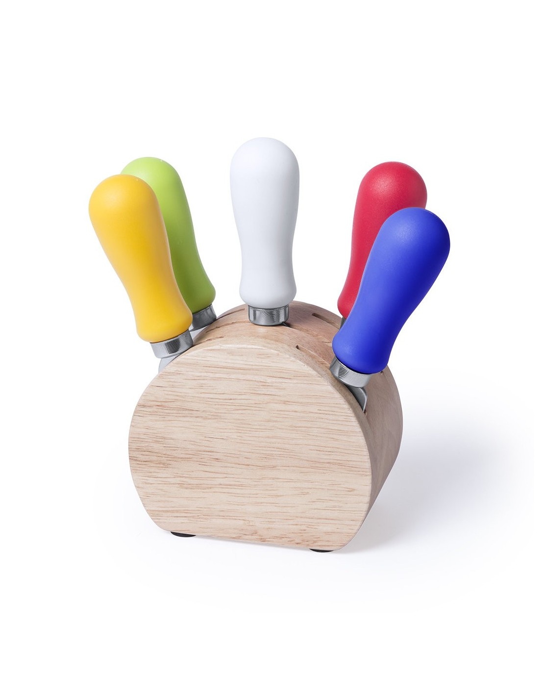 Set para quesos de 6 piezas. Con cuchilla en acero inox y mango ergonómico en variada gama de vivos colores. En base de madera natural con superficie antideslizante y presentado en atractiva caja de diseño.