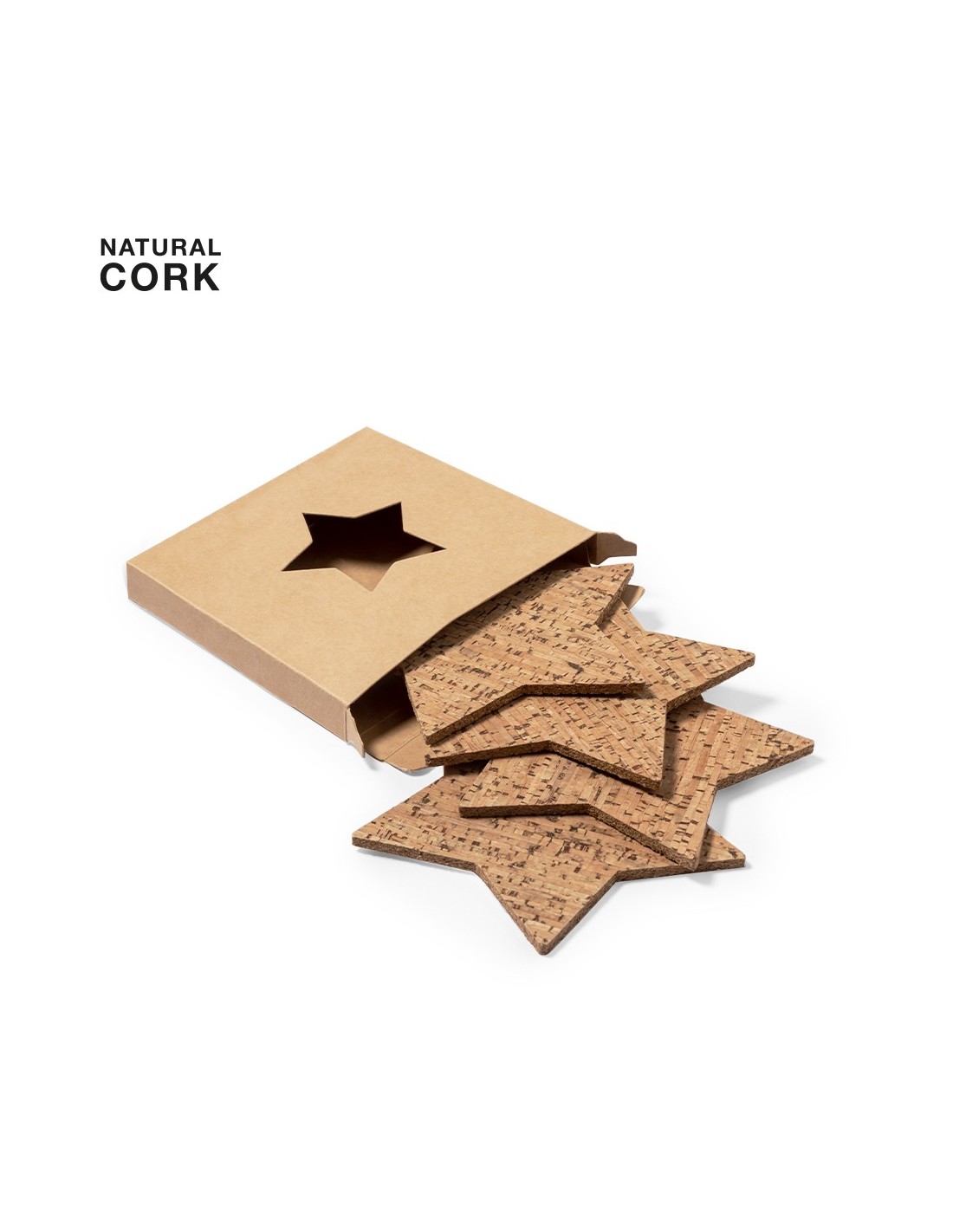 Set de 4 posavasos con forma de estrella fabricados en corcho natural. Set presentado en caja de diseño en cartón kraft con diseño de estrella troquelado. Elaborado con elementos vegetales para así fomentar la utilización de materias primas naturales y reducir las emisiones contaminantes.