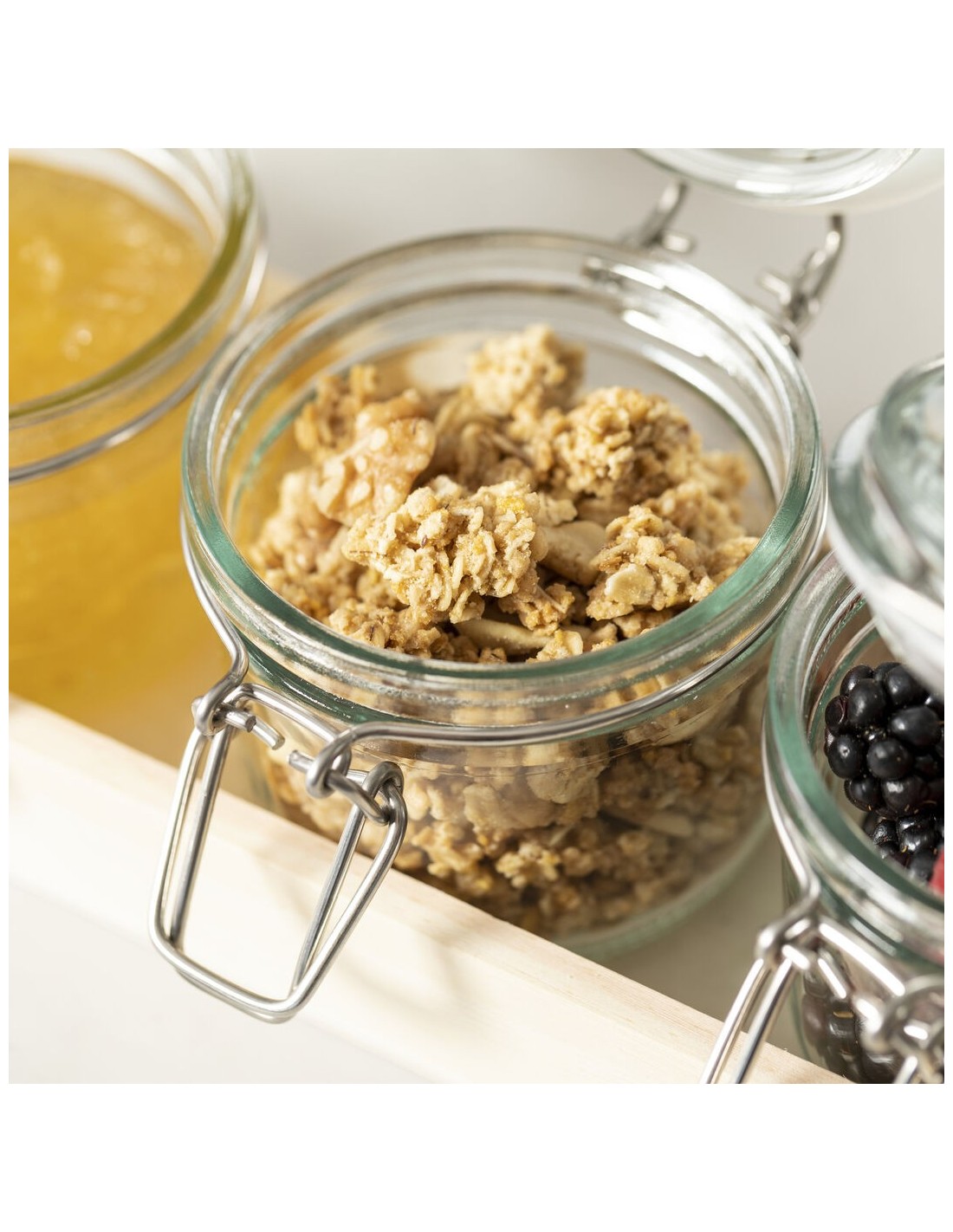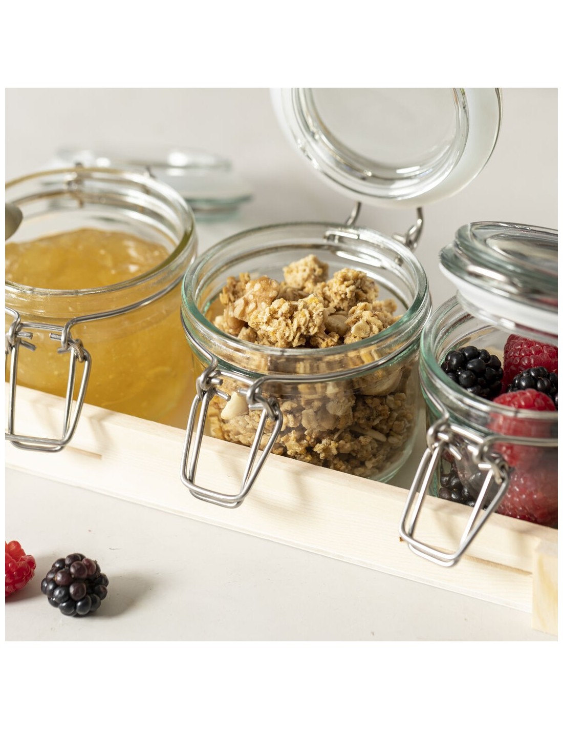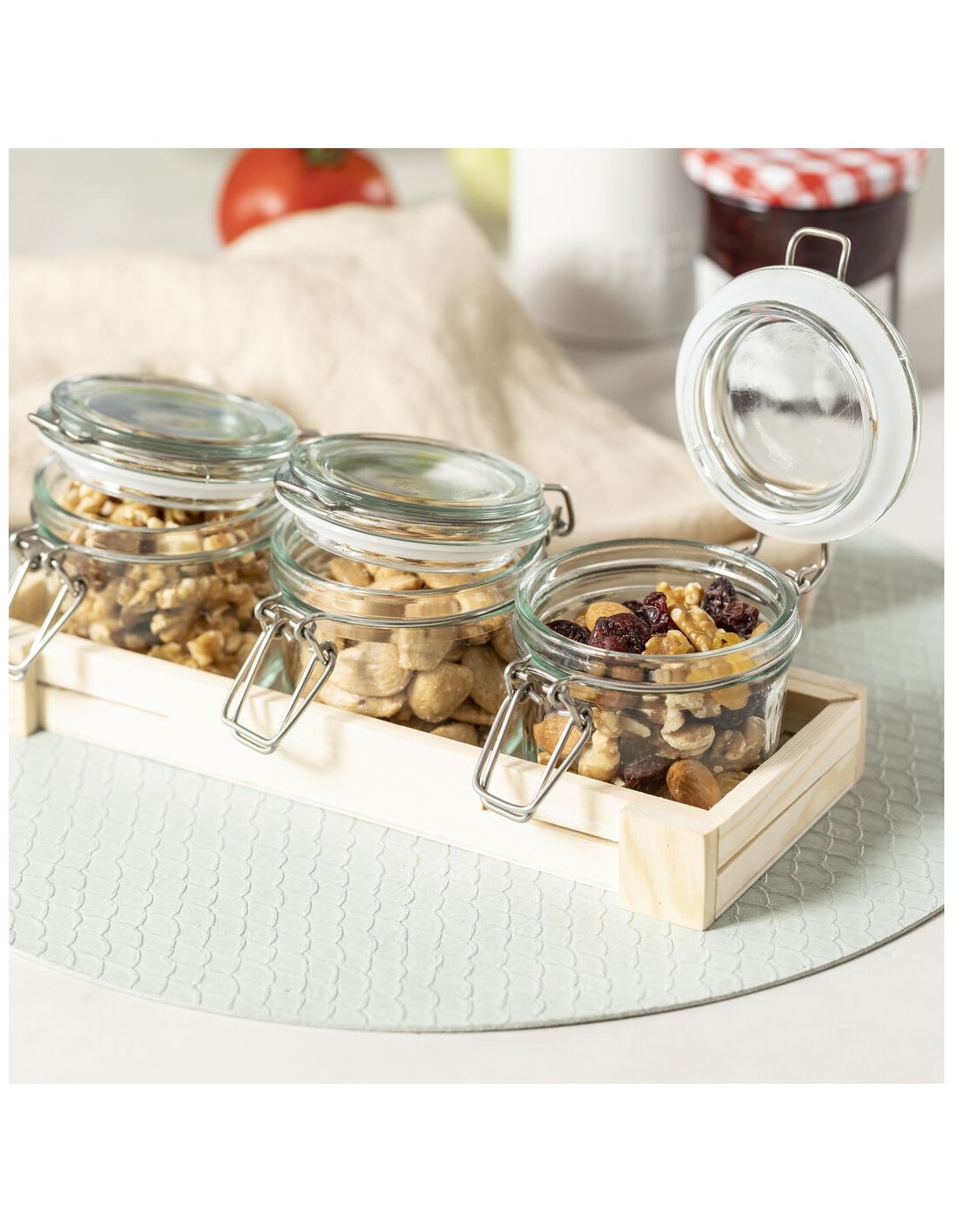 Set de 3 Tarros de Cristal con 230 ml de capacidad. Complementos versátiles para organizar tu casa, cocina, despensa… según tus gustos y necesidades. Fabricados en cristal, y con cierres a presión de acero inoxidable, una combinación de materiales que ofrecen gran resistencia y durabilidad. Presentados en bandeja de madera y en caja individual de diseño eco.