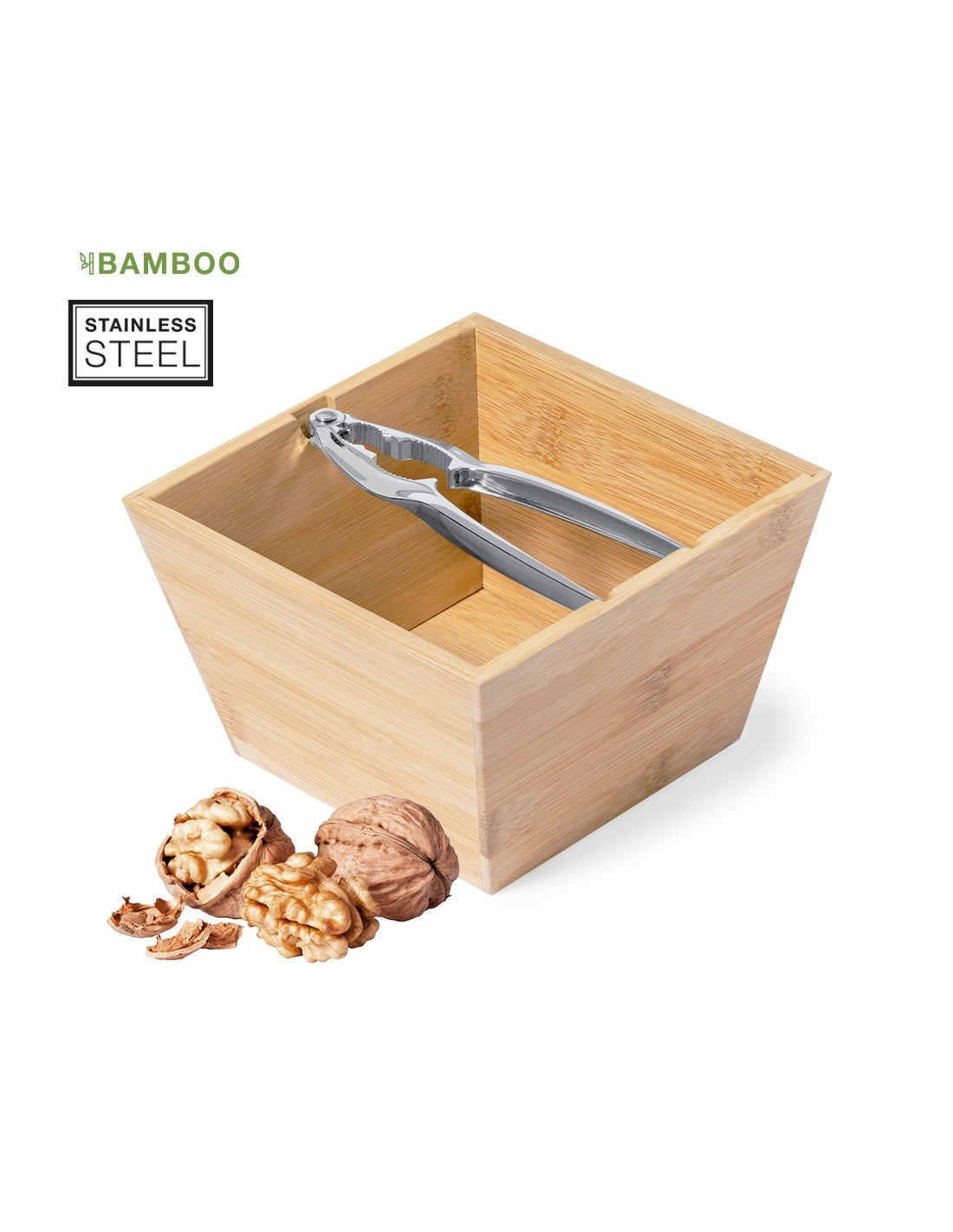 Práctico set cascanueces. Contenido: Bowl fabricado en bambú natural, con 1,4 l de capacidad. Cascanueces de acero inoxidable, con diseño ergonómico que permite romper la cáscara de manera rápida y sencilla, manteniendo el fruto intacto. Presentación individual en caja de diseño kraft.