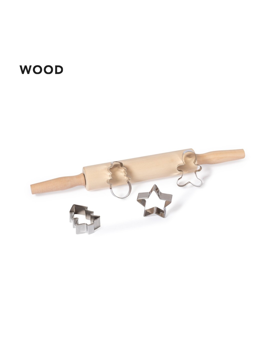 Set de repostería con moldes navideños en acero inoxidable y rodillo fabricado en resistente madera natural. Incluye rodillo amasador y 4 moldes en forma de Árbol de Navidad, Estrella, Muñeco de Nieve y Hombre Jenjibre. Presentado en caja kraft.