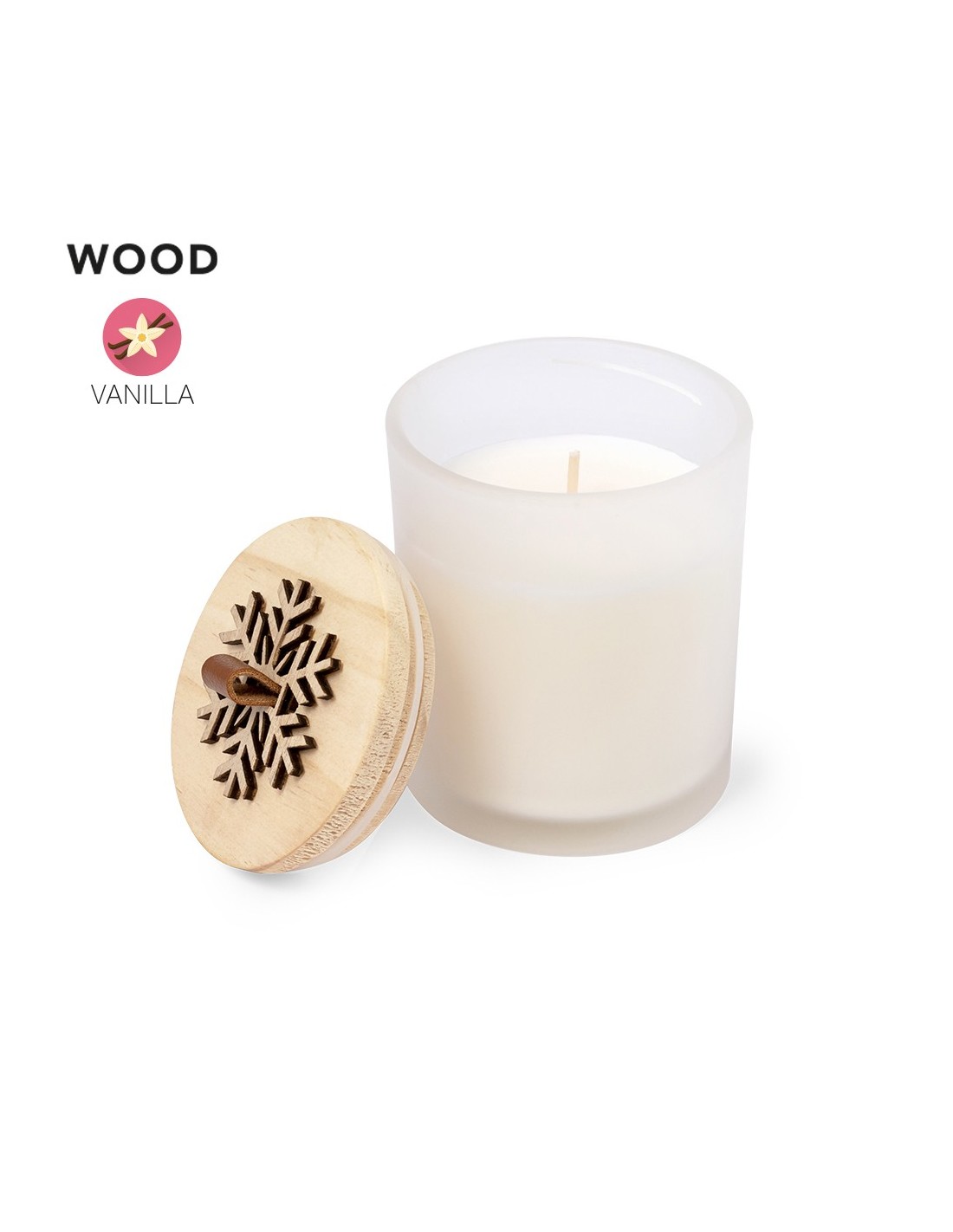 Vela de diseño navideño con aroma vainilla. Fabricada en cristal, con tapa de madera pulida y relieve diseñado en forma de copo de nieve. Presentada en atractiva caja individual kraft.