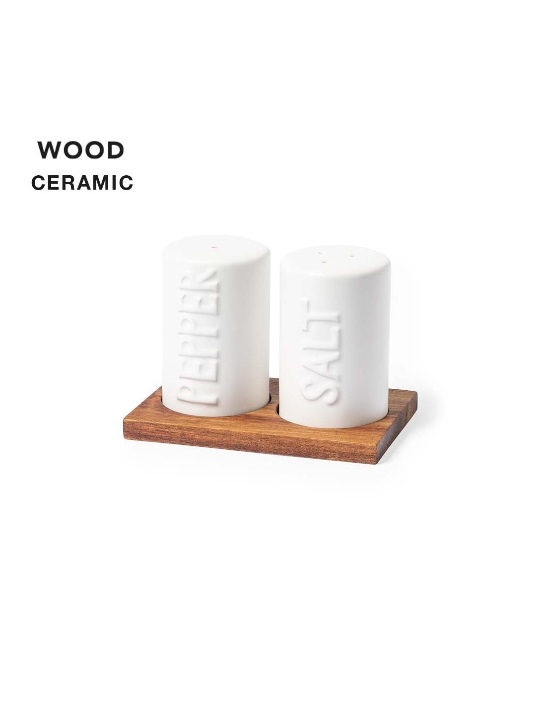 Set de salero y pimentero en blanco y fabricados en cerámica. Incluye base en madera natural de acacia, troquelada para encajar el salero y el pimentero. Presentación en caja individual de diseño kraft.