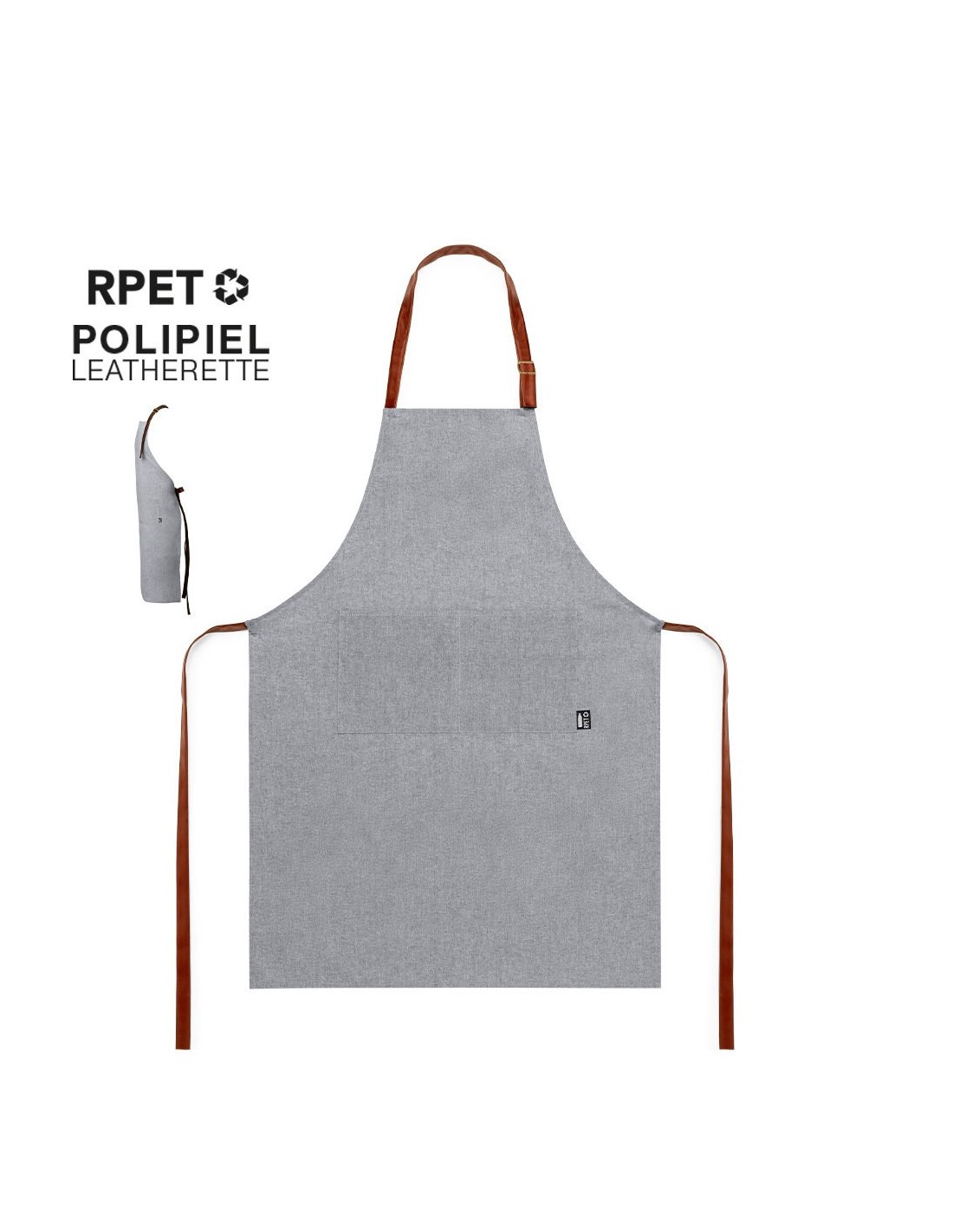 Delantal de línea nature en material RPET, elaborado a partir de plástico reciclado, para así fomentar la reutilización de residuos plásticos y ayudar a la sostenibilidad del planeta. De corte por debajo de la rodilla, con cintas de ajuste en resistente polipiel y amplio bolsillo frontal. Etiqueta en bolsillo con distintivo RPET.