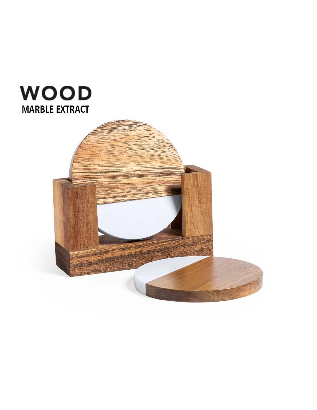 Elegante set de posavasos premium. Fabricado en combinación de materiales naturales: madera de acacia con detalle en extracto de mármol. Incluye 2 piezas, con soporte a juego en madera de acacia. Presentado en caja individual de diseño kraft.