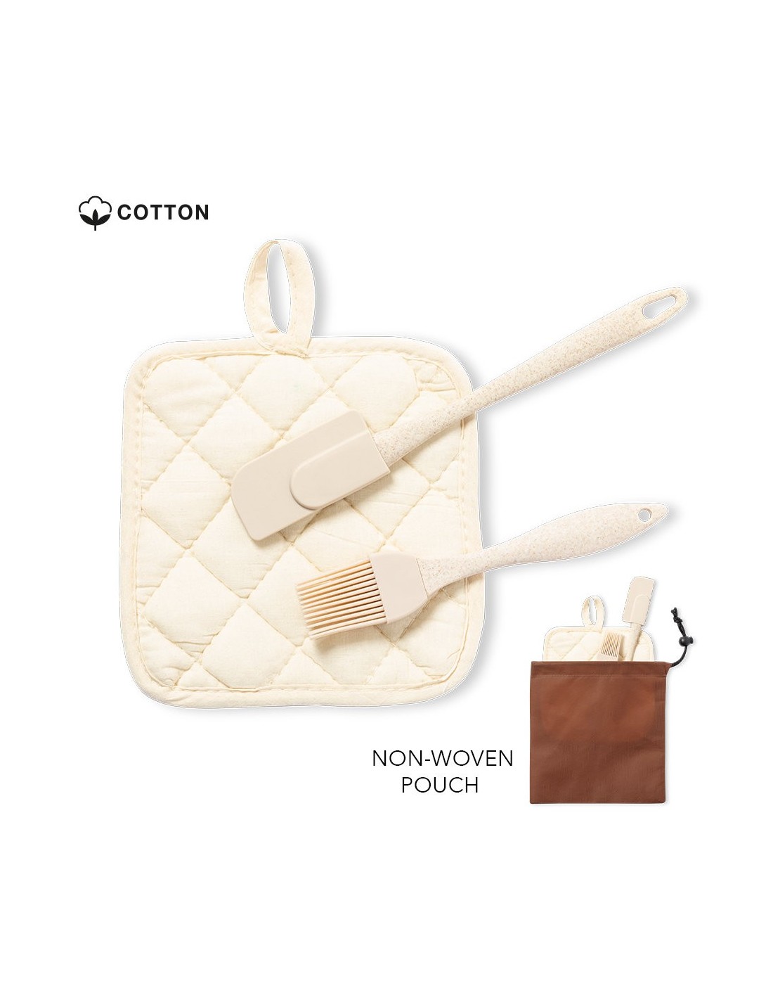 Set de cocina de 3 piezas presentado en funda marrón con cordón de cierre. Incluye: Espátula y brocha de silicona en tono natural, con mangos troquelados en resistente PP veteado. Agarrador en 100% algódón de acabado natural, con cinta para colgar.