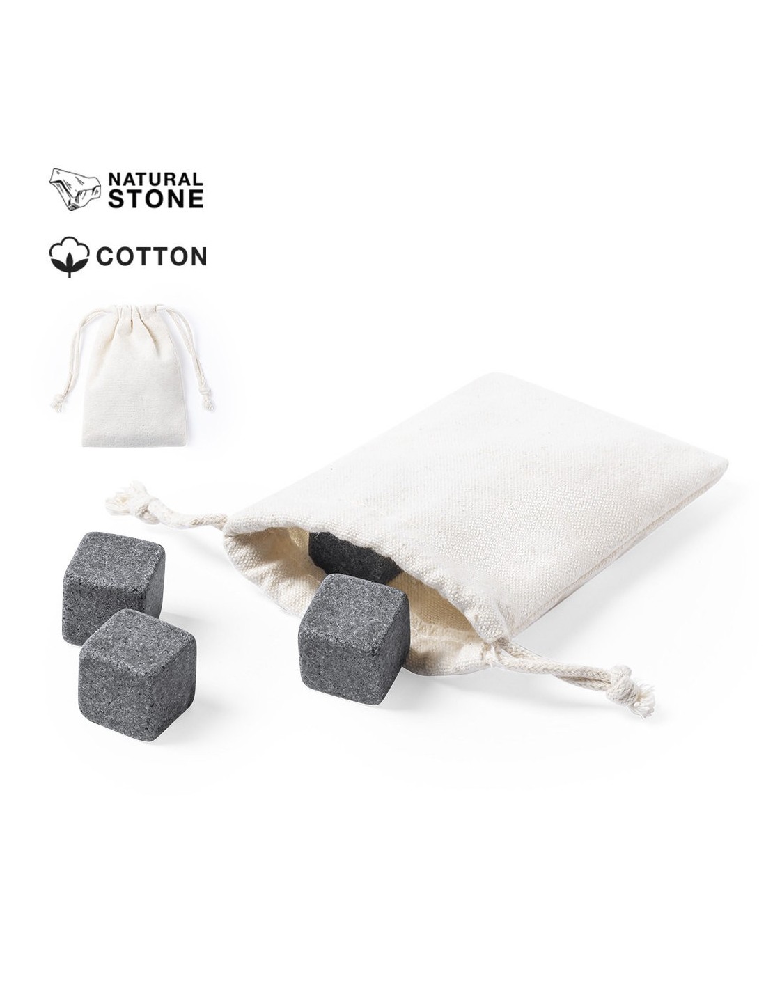 Set de 4 cubitos reutilizables. Fabricados en piedra natural esteatita, también conocida como piedra o roca de jabón, que mantiene la bebida fría sin alterar sus propiedades al no diluir su contenido en agua, además de mantener el sabor original de la misma. Presentados en funda de algodón con cordón de cierre.
