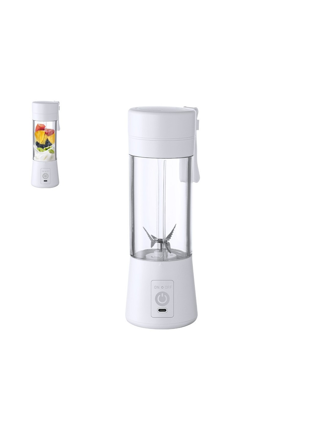 Licuadora fabricada en resistente material ABS de acabado blanco. De 380ml de capacidad y 150W de potencia, con limpiador y pinza incluidos. Batería de 2.000 mAh de capacidad, con conexión Tipo C (cable incluido). Presentada en caja individual de diseño kraft, con manual de instrucciones en español e inglés.