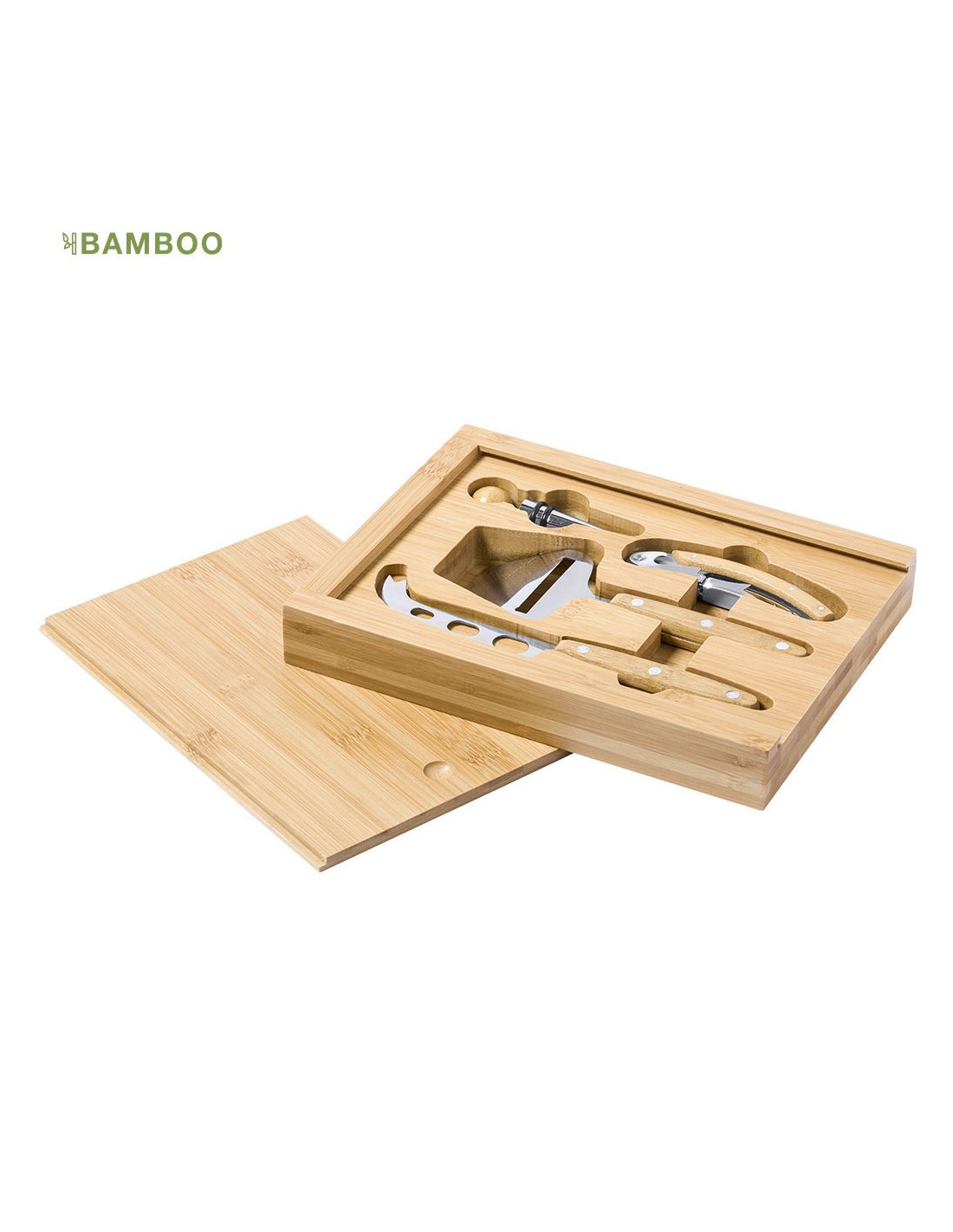 Completo set de vinos y quesos de 4 piezas. Fabricado en bambú, con tapa-tabla de corte y accesorios metálicos con mango de bambú. Incluye sacacorchos, tapón, cuchillo y rallador de queso. Presentado en caja individual de diseño eco.