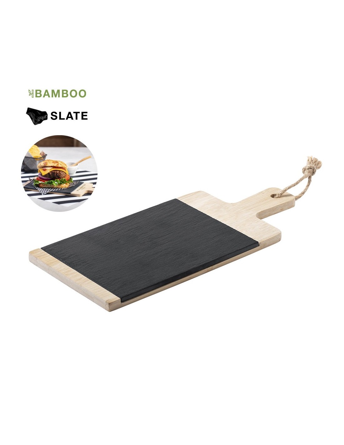 Tabla fabricada en combinación de materiales bambú y pizarra, de suave y resistente acabado pulido. Ideal para corte y presentación. Con asa para fácil manejo y cordón para colgar. Tabla de pizarra extraíble para fácil limpieza. Presentada en atractiva caja individual de diseño eco.
