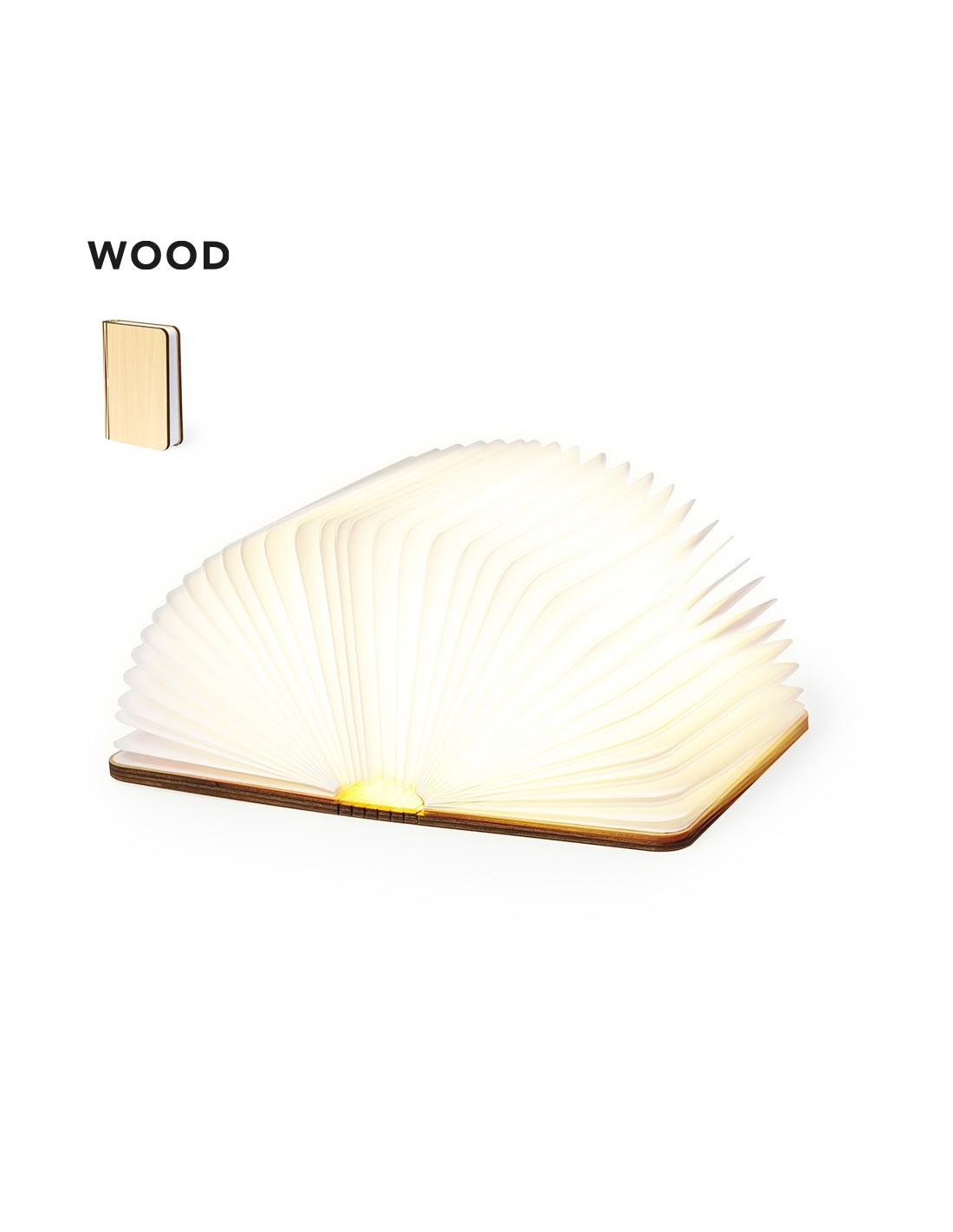 Original lámpara portátil LED con forma de libro. Fabricada en madera, cuenta con un interior que simula hojas de papel, iluminadas por 16 LEDs. Recargable mediante batería de 700mAh, con cable cargador USB incluido. Presentado en caja de diseño kraft.