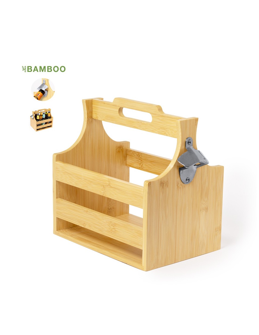 Práctico soporte para botellas hecho en bambú. Original caja de transporte de bebidas con asa troquelada en la parte superior y un abridor de botellas metálico en un lateral, con capacidad para 6 botellines. Presentado en caja de diseño kraft.