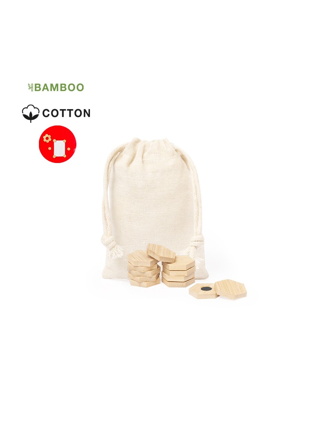Set de imanes fabricados en bambú. Incluye 12 piezas pentagonales talladas en bambú con imán para poder fijar anotaciones, fotos, etc., en cualquier superficie metálica. Presentados en bolsa de algodón. .Materiales como el bambú fomentan la utilización de materias primas naturales, reduciendo las emisiones contaminantes. Proviene de una planta de gran resistencia y versatilidad, con crecimiento y regeneración rápidos, siendo una excelente alternativa al uso de madera tradicional.