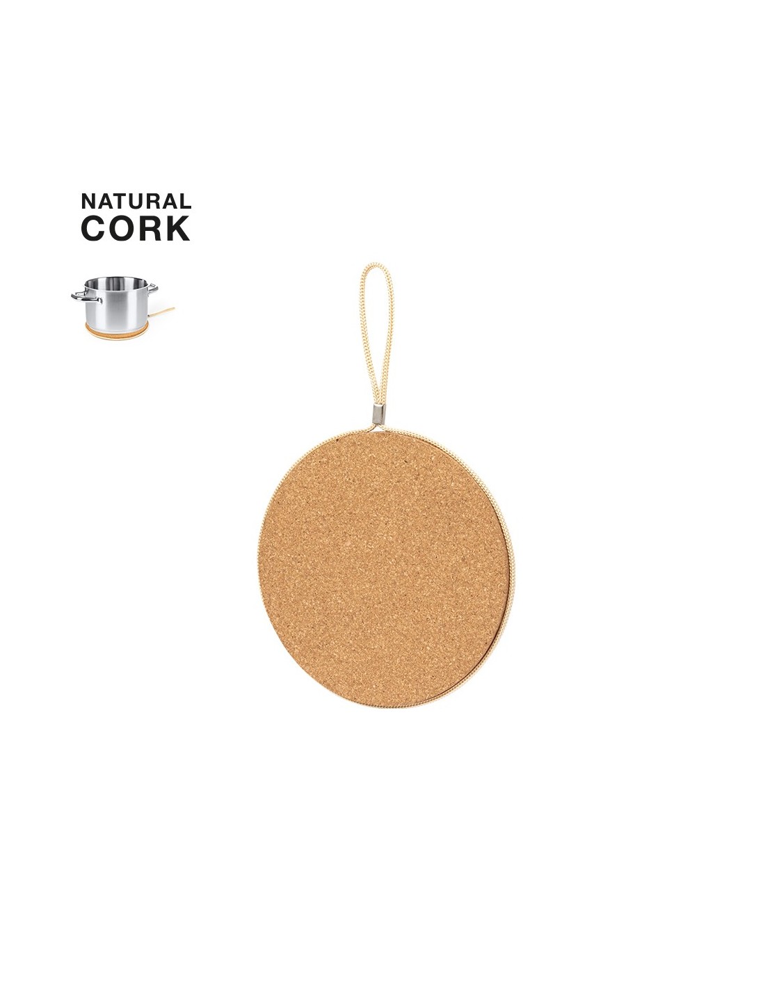 Práctico soporte de cocina fabricado en corcho natural. Es resistente a altas temperaturas y está especialmente diseñado para apoyar recipientes calientes como ollas y sartenes, preservando la superficie que hay debajo. Con cordón en la base para colgar. .Elaborado con elementos vegetales para así fomentar la utilización de materias primas naturales y reducir las emisiones contaminantes..