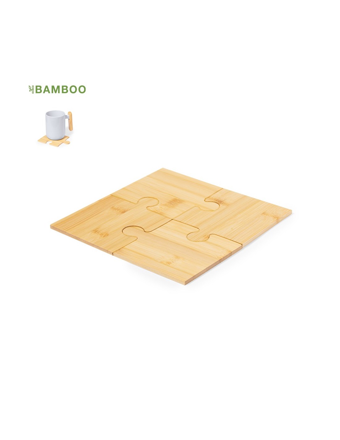 Set de posavasos fabricados en bambú. Consta de 4 piezas diseñadas en forma de puzle. Presentado individualmente en caja diseño kraft. .Materiales como el bambú fomentan la utilización de materias primas naturales, reduciendo las emisiones contaminantes. Proviene de una planta de gran resistencia y versatilidad, con crecimiento y regeneración rápidos, siendo una excelente alternativa al uso de madera tradicional.