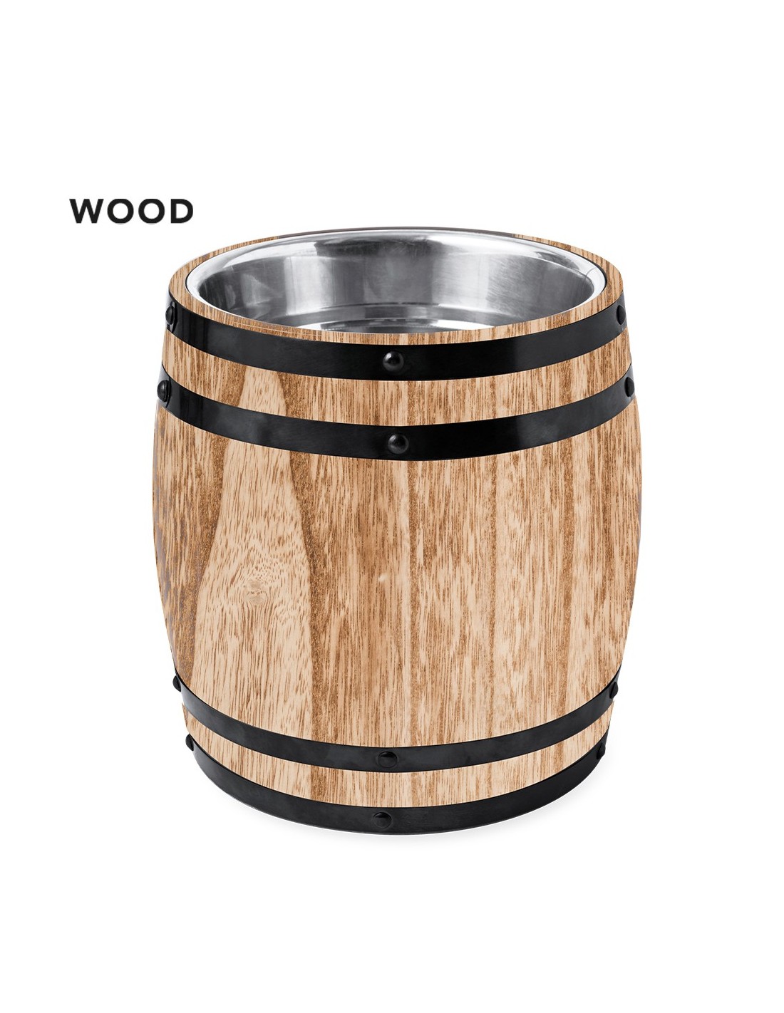 Original cubo de acero con exterior de madera. Forma de barril para conservar bebidas frías o hielos gracias a su doble pared de acero inox con 3L de capacidad. Presentado individualmente en caja de diseño kraft.