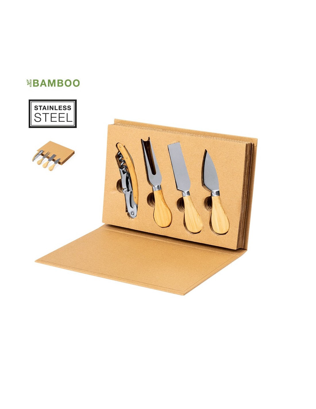 Set de quesos y vino con accesorios fabricados en resistente acero inox, con mango en bambú. Accesorios presentados en un original estuche de cartón corrugado, con interior troquelado para cada uno. Incluye utensilios para quesos duros, blandos y troceados; y un abridor de dos tiempos con cuchilla cortacápsulas..Materiales como el bambú fomentan la utilización de materias primas naturales, reduciendo las emisiones contaminantes. Proviene de una planta de gran resistencia y versatilidad, con crecimiento y regeneración rápidos, siendo una excelente alternativa al uso de madera tradicional.
