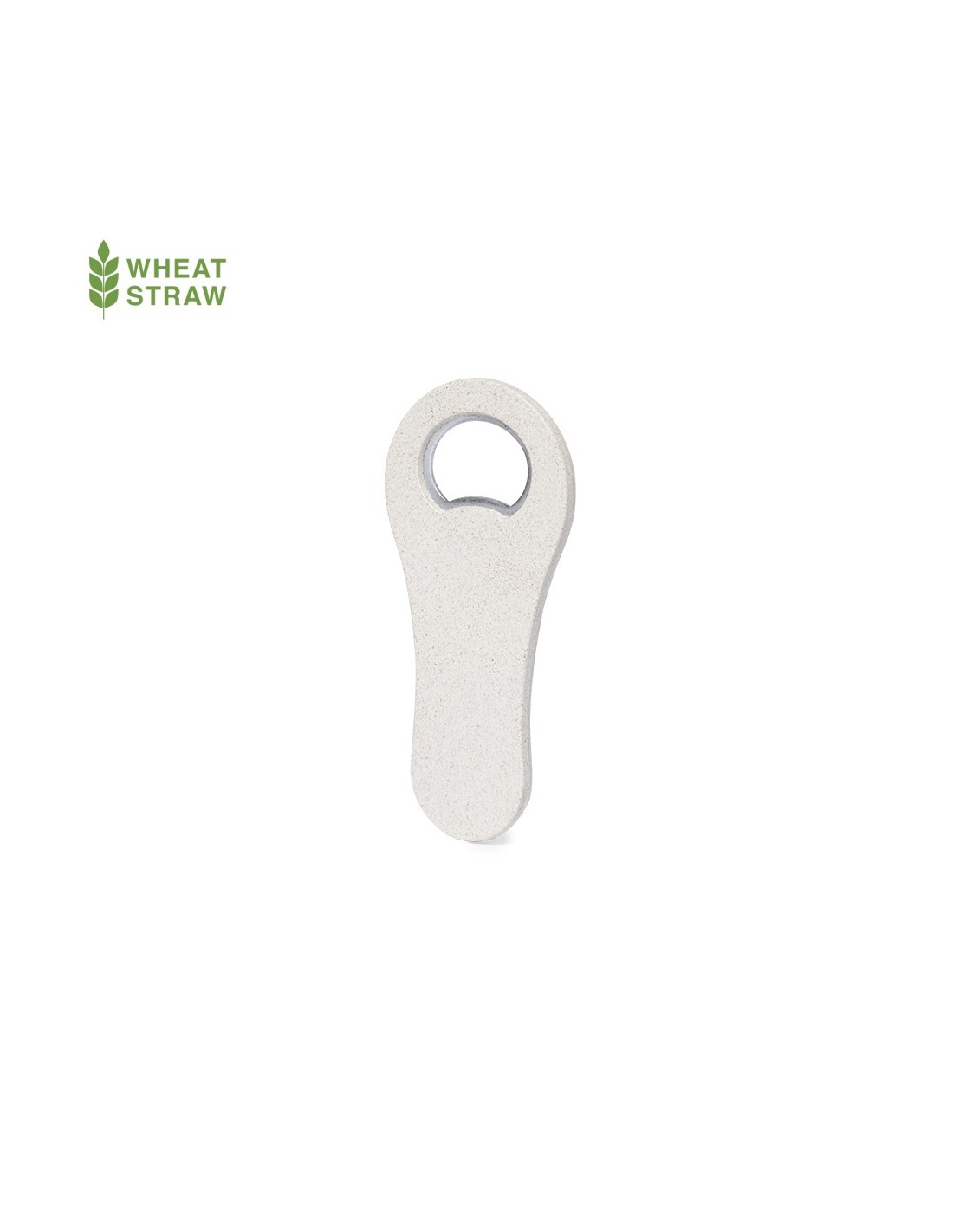 Abridor de botellas fabricado en caña de trigo. Cuenta con un imán que permite adherirlo a cualquier superficie metálica. Presentado individualmente en bolsa de papel reciclada. .La caña de trigo fomenta la utilización de materias primas naturales, reduciendo así las emisiones contaminantes.