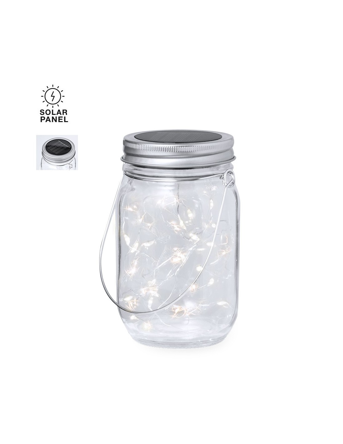Original lámpara tarro solar, fabricada en resistente material cristal y con una tira interior decorativa de 20 LEDs. Incluye tapadera a rosca metálica con minipanel solar de recarga integrado y una batería recargable de 300 mAh. Con práctica asa para transportar o colgar, y presentada en caja individual de diseño kraft.
