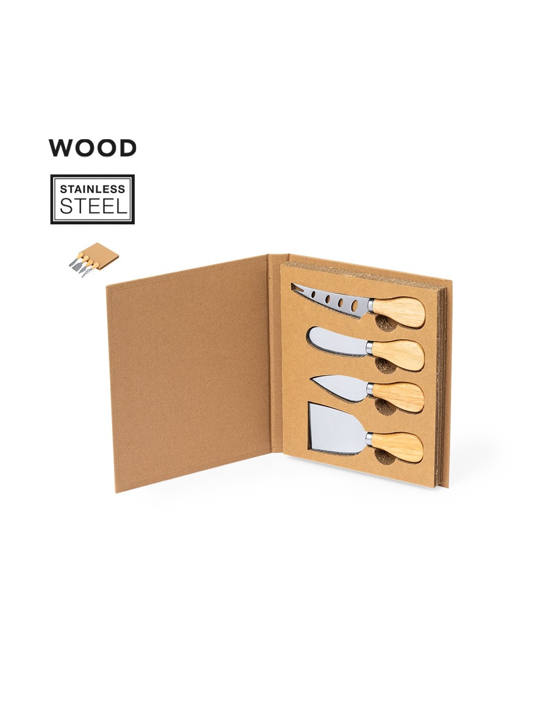 Set de quesos fabricado en madera. Utensilios fabricados en acero inox y mango de madera, con cuatro modelos diferentes: para quesos duros, quesos blandos, quesos semiduros y quesos en trozos. Presentados en original estuche de cartón reciclado, con interior troquelado para cada accesorio.