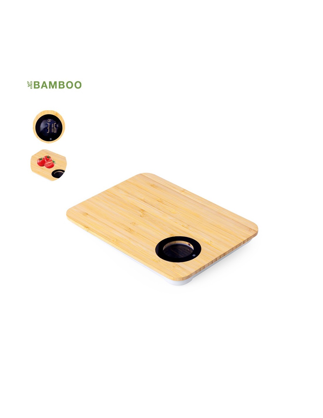 Tabla de corte fabricada en resistente bambú, con báscula digital integrada. Báscula con pantalla LCD que indica el peso en kg (máximo 5kg) y botón táctil ON/OFF. Con funciones de apagado automático, tara y selección de unidad de medida. Alimentado por 2 pilas AAA (no incluidas), con base antideslizante y troquelado para colgar. Presentada individualmente en caja de diseño kraft. Materiales como el bambú fomentan la utilización de materias primas naturales, reduciendo las emisiones contaminantes. Proviene de una planta de gran resistencia y versatilidad, con crecimiento y regeneración rápidos, siendo una excelente alternativa al uso de madera tradicional.