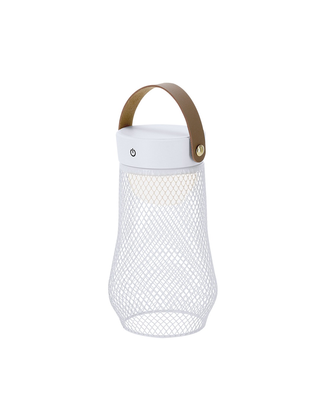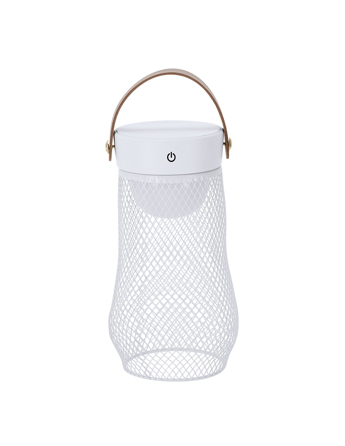 Lámpara de diseño en metal. Incluye asa superior en suave PU. Dispone de 3 modos de luz (blanca, neutra y cálida). Equipada con 24 LEDs. Ideal tanto para espacios interiores como exteriores. Botón táctil integrado para encendido, apagado y la selección del modo de luz. Equipada con batería recargable de 1.200 mAh y entrada Tipo C.