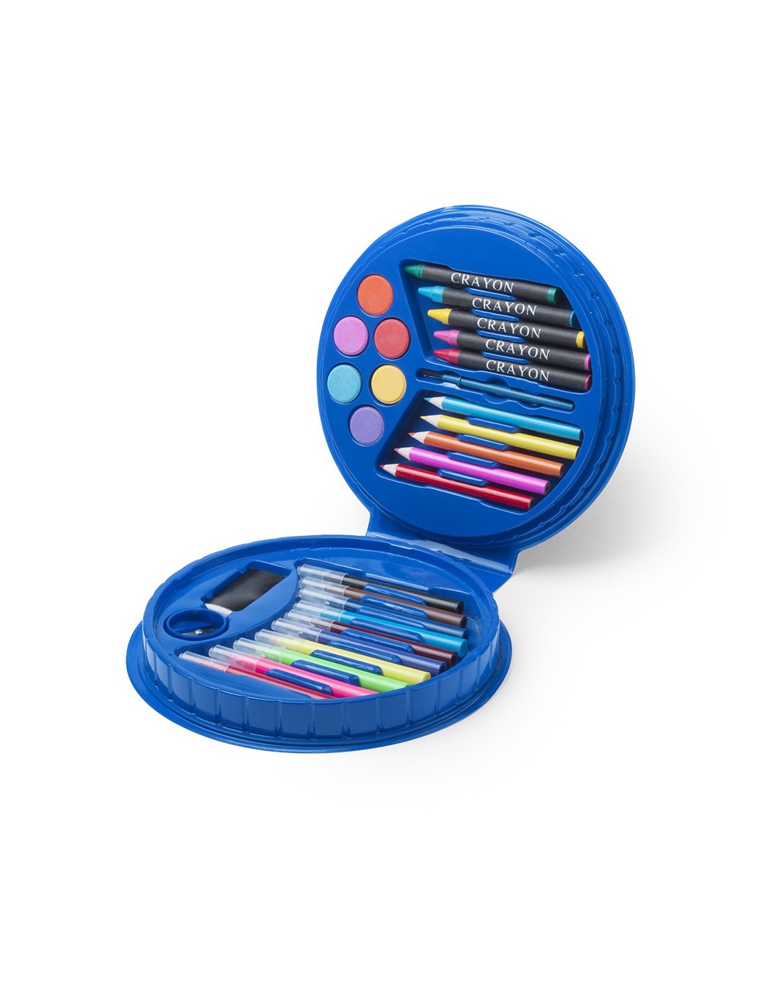Set de 14 piezas en estuche de diseño circular con resistente cuerpo acabado en brillantes colores e interior con compartimentos de seguridad. Contiene goma; sacapuntas; ceras y lápices de madera de cuerpo cilíndrico; rotuladores; acuarelas y pincel.